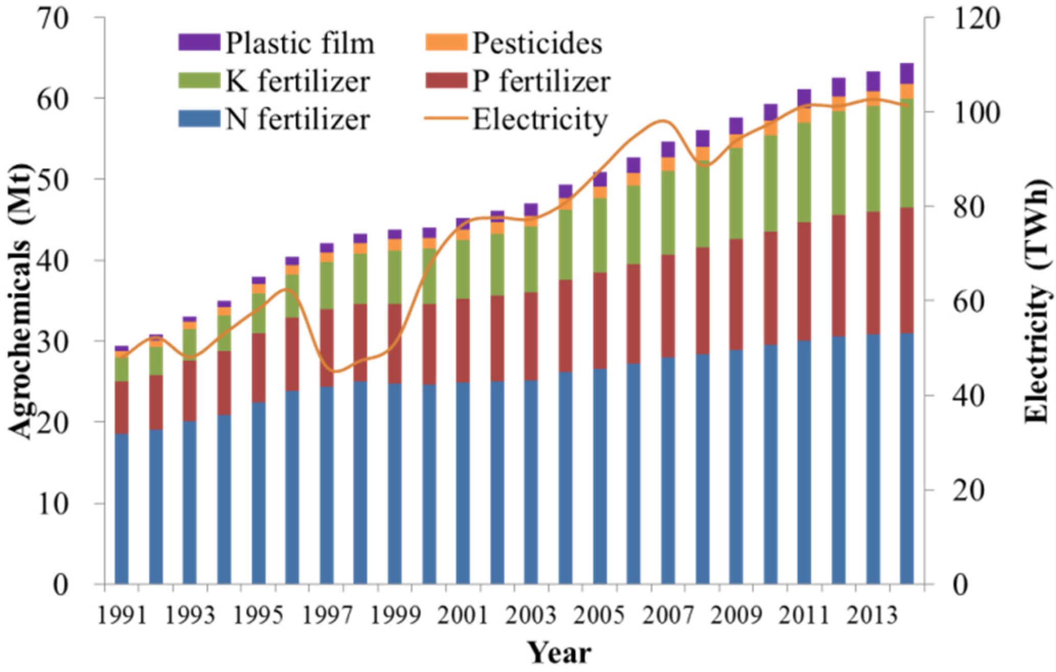 The increase in agricultural output value in China was mainly due to the switching from low-valued grain crops to high-valued cash crops or fruits, crop variety improvement, and the above-mentioned agricultural inputs. Population growth and the associated increase in food and income demands have been a major force driving the continued increases in agricultural output value and agrochemical and energy inputs in China.