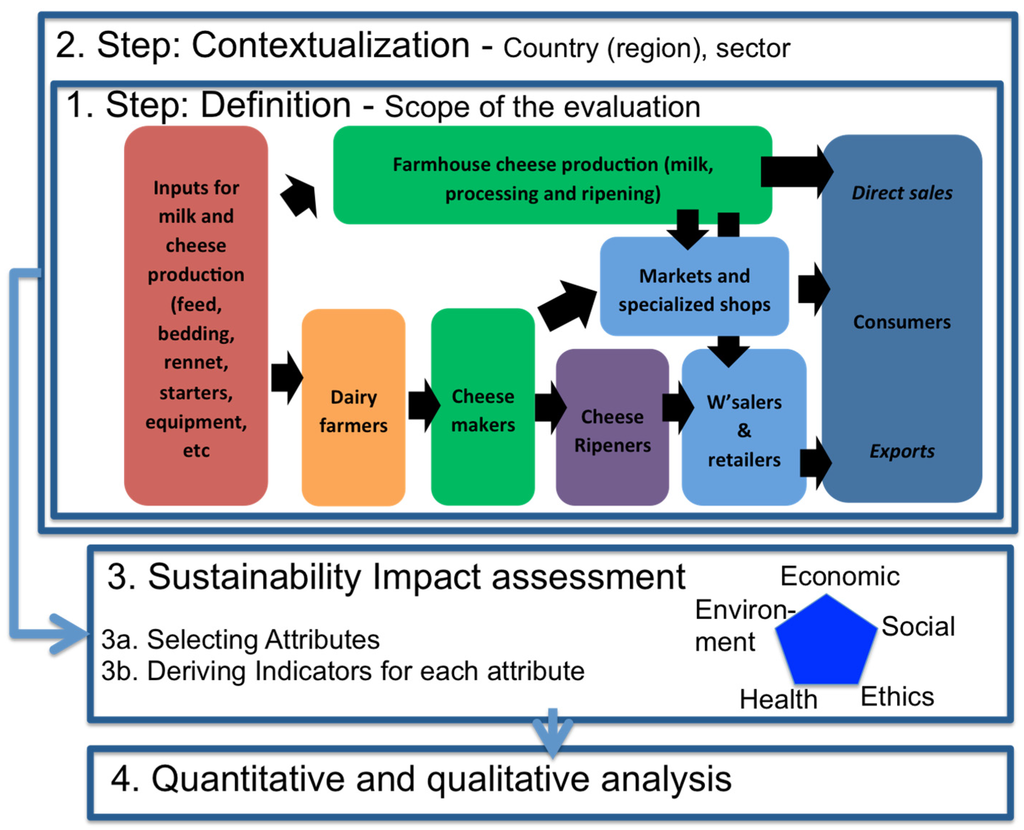 The process of sustainability assessments and comparison followed the framework described in Figure 1. The first step was to define the object under study, and the precise scope of the food chains used as case studies. The focus has been in accordance with the definition of a core food chain from Neven ([8], p. 11), which includes actors who have the functions of “production, aggregation, processing and distribution”. Thus, the stages of the chains most emphasised in the study are agricultural production, primary processing (milk aggregation and cheese making) and secondary processing (cheese refining). The upstream inputs stage is difficult to take into account entirely, due to the difficulty of securing information about input production and transport and the extensive interactions these processes have with many other food chains. Nevertheless, our data collection includes upstream inputs as much as possible. Packaging, export, and retailing were only marginally taken into account because of limited access to data and the very high level of interaction with other chains. The consumption stage was studied using consumer focus groups. The data collection was thus particularly oriented towards those downstream stages of the core food chain and included interviews at each stage and for each case study.