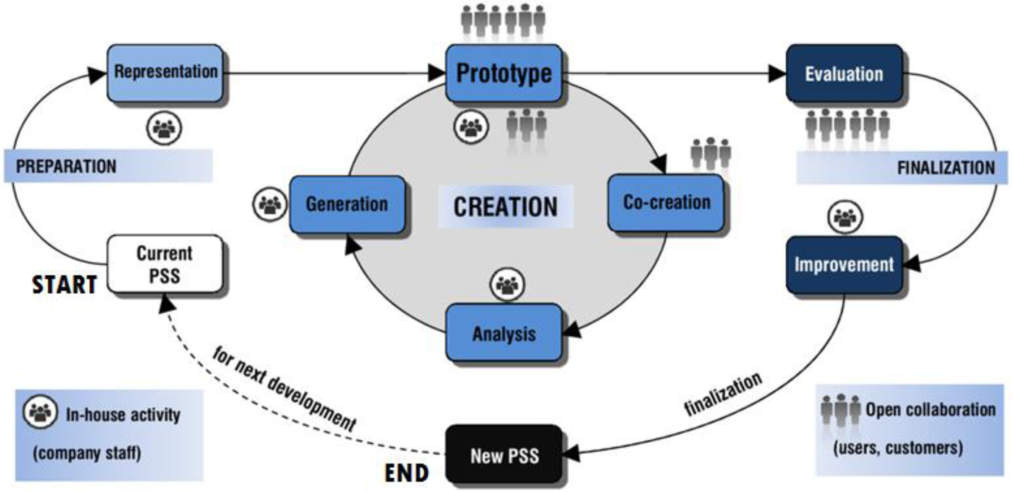 The design and development of PSS is a participatory process, and thus, co-creation has been mentioned in the literature as one of the success enabling factors for PSS [6,11]. Co-creation refers to the participation of customers or users in various phases of its lifecycle, such as ideation, design, development and implementation (i.e., use), etc. The role of user participation is critical to the success because of the importance of users in a PSS model. Users are among the most important stakeholders, and because of the presence of the “service” part in which users only buy or hire things that help them to get jobs done [3,9], users’ voices deserve a deep consideration. As pointed out by Vansantha et al., to improve PSS design, co-creation is employed limitedly in existing PSS design methods [6].