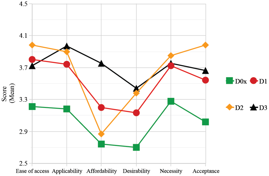 Figure 3 shows that, for all criteria, designs that were suggested by users (i.e., D1, D2 and D3) perform better than the design that was developed solely by Mulenserv’s designers (i.e., D0X, represented by the line with square points), especially in terms of “ease of access”, “applicability” and “acceptance”. This shows the outperformance of user-suggested designs, and thus, it shows the benefits of user co-creation and the use of the proposed framework.