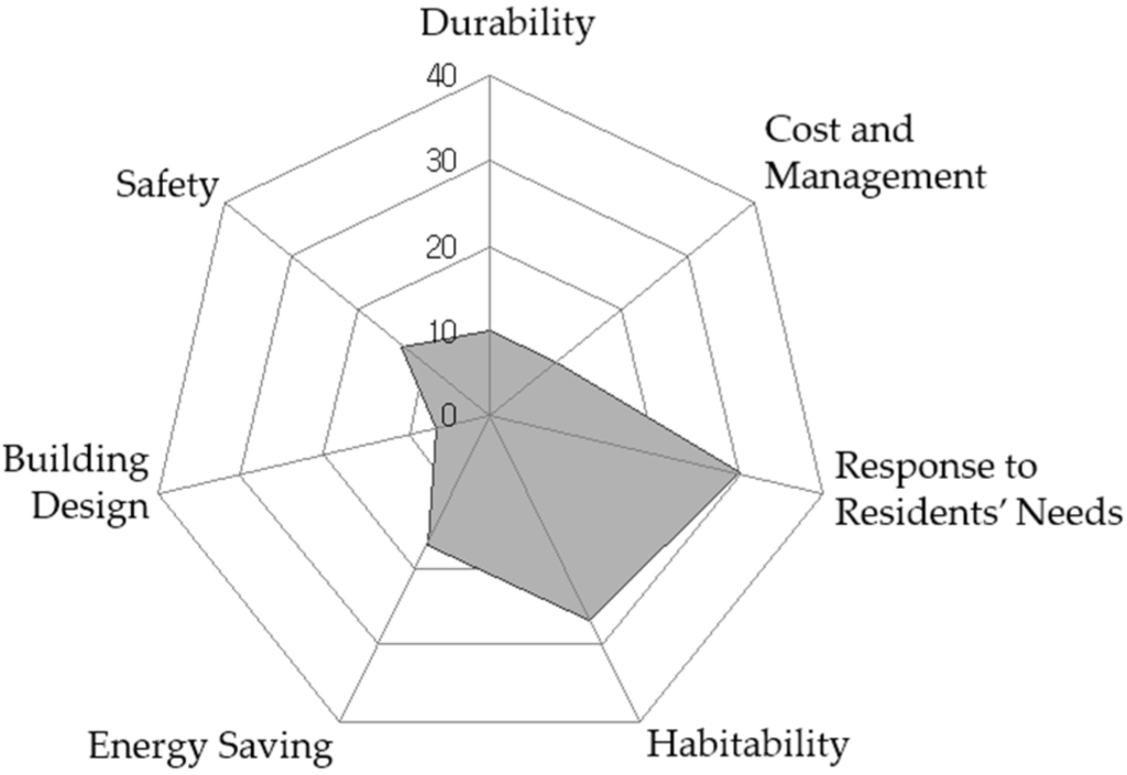 Table 2 shows South Korea’s current status regarding housing quality improvement policies. From the performance aspect, safety, durability, cost, and maintenance all carried almost equal weight, but many policies were biased toward the functional aspect as shown in Figure 2. Particularly in terms of housing quality improvement, G-SEED is being operated by assessing the building’s eco-friendly elements from functional aspect and issuing certificates [19]. The Building Act and the Housing Act previously had overlap in terms of eco-friendly buildings and their certification criteria. Now, the Green Building Certification Criteria and the Housing Performance Rating System, which were sub-regulations in each act, were combined as the G-SEED. The Housing Performance Rating System was separated in 2014 and is currently operating to allow consumers to examine housing performance beforehand.
