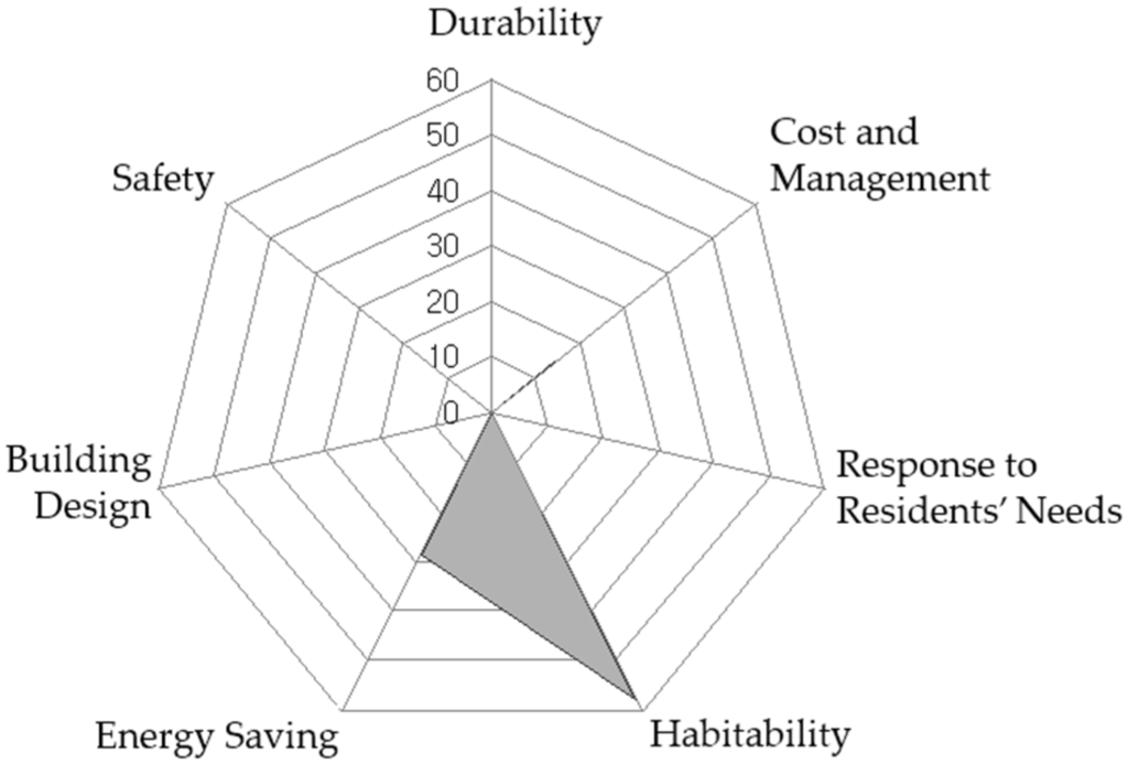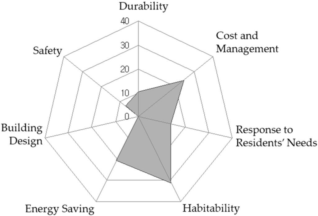 For policies on the performance aspect of housing, there was legislation on the promotion of earthquake-resistance improvement for buildings, the Model Anticrime Mansion Certification System, the Century Housing System, the Safe Interior Material Certification System, Standard Value mark, and the High-rise Building Performance Certification System. These are systems that do not exist in South Korea, and most of them have been found to emphasize safety and durability with regard to the performance category [23]. Particularly, the High-rise Building Performance Evaluation System is a program that assesses the structural safety of high-rises higher than 60 meters.
