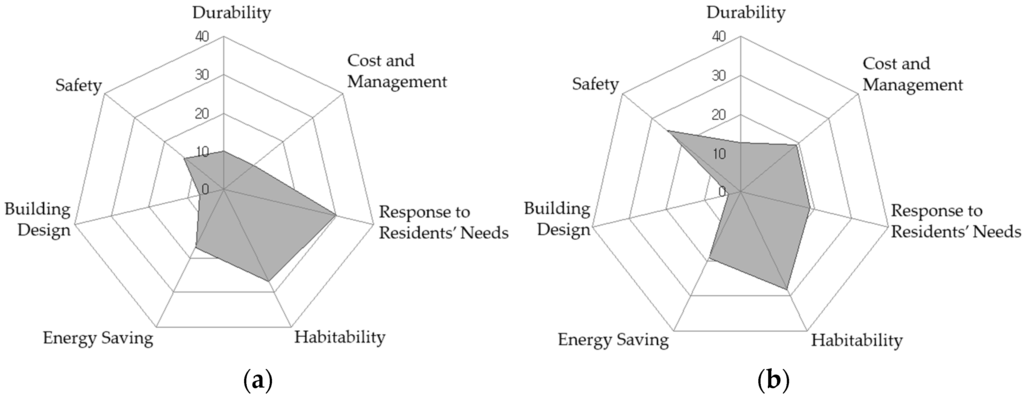 Regarding the performance aspects, the weight on policies for cost and maintenance was high among other categories. This was shown to be the result of US housing improvement programs for low income people, the disabled, and the elderly. Meanwhile, the HOW Program was studied as the US’s housing performance assessment rating system, made based on the UK’s NHBC [27,28]. Similar systems were France’s Qualitel and Japan’s Housing Quality Assurance Act. Whereas South Korea’s Housing Performance Rating System is a requirement by law, the US’s HOW Program was being run through self-regulation by those in the industry [29,30].