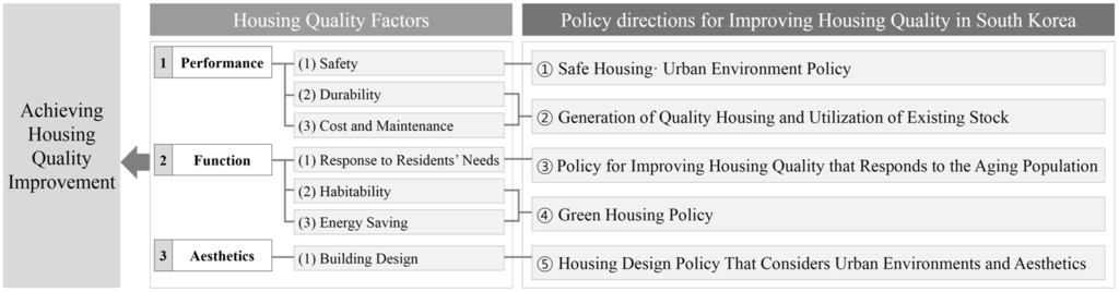 - We categorized housing quality as having three aspects: performance, function, and aesthetics. Policies on improving housing quality in Japan, the US, Canada, the UK, and Germany, and proposed policy directions for improving housing quality in South Korea were analyzed.