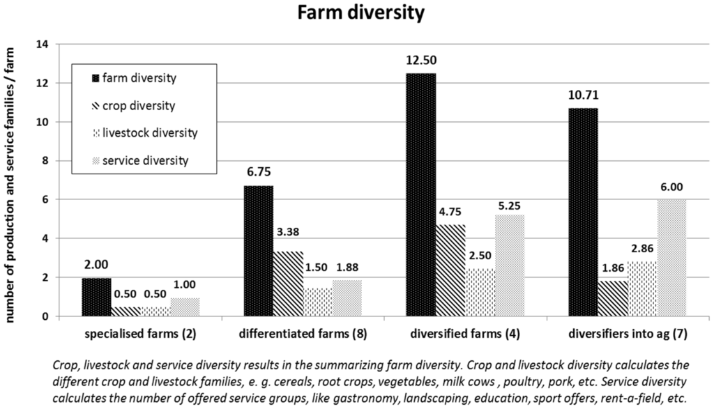The calculated farm diversities result from the addition of crop, livestock, and service diversity. Within this survey, diversified business models show higher farm diversities than the differentiated and specialized farms. The diversified farms reach the highest farm diversity value (12.5) followed by the diversifiers into agriculture (10.71), while it is considerably lower for the specialized farms (2.0) (Figure 2).