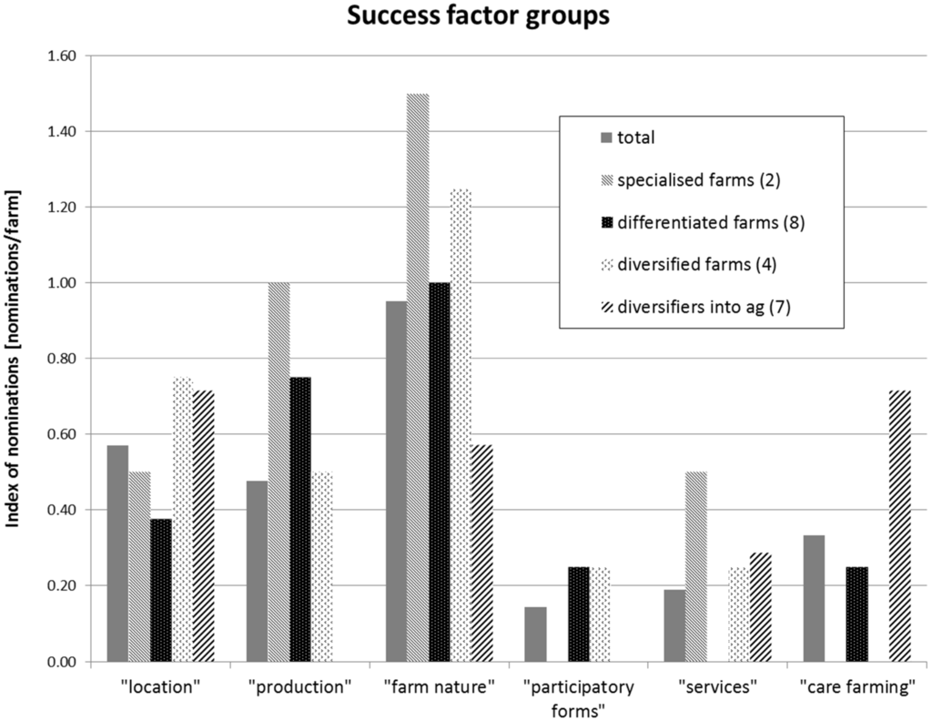 For a better overview of named success factors, Figure 3 groups answers into six categories: location, production, farm nature, participatory forms, services, and care farming. The success factor location is strongly emphasized by diversified farmers and diversifiers into agriculture both with nomination rates of more than 70%. The category location consists only of one success factor, while the remaining five categories cover several nominations. Eleven of the 12 farmers name location in combination with success factors from the group “farm nature”, like “sociability”, “personal contact to clients”, “tradition”, and “family-owned farming”. This means that urban environments offer advantageous locations in case the farms make use of the proximity to a huge consumer market through positive loaded farm attributes and personal producer-consumer contacts.