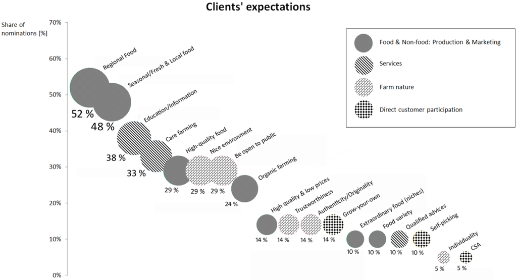All the farms naming “good food for low prices” as a clients’ expectation do not call any other food-related criterion, like regional, seasonal, fresh, quality, and organic. Fourteen of the 21 farms naming food-related criteria combine more than just one single food-related criterion. This leads to the suggestion that clients expect more than just one food-related aspect, for instance regional combined with organic, quality combined with seasonal, etc. Furthermore, it seems not to be sufficient to just focus on regional product marketing. All farms naming regional food as clients’ expectation link it to additional food-related criteria, most often with seasonal/fresh food.