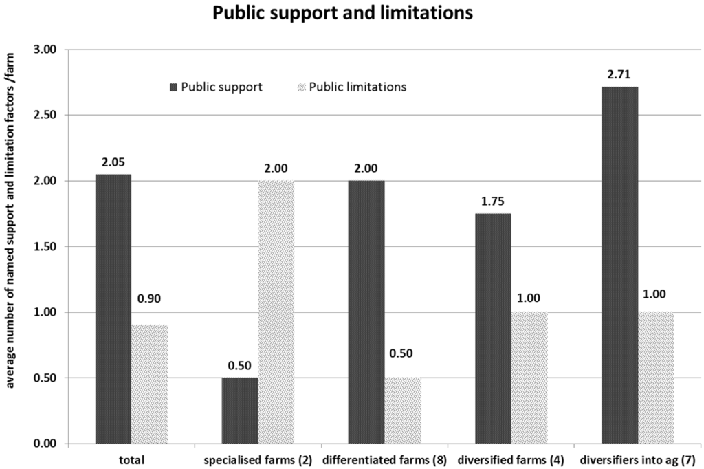 Public support contributions are mentioned more than twice as often as public limitations (Figure 5). This relation fits to the three business models of differentiation and diversification, while the two specialized farms name more limitations than supportive aspects. The named public supports are all focusing on financial issues, while public limitations cover a wider range of topics. All supportive arguments are limited to public payments into the farming sector. CAP direct payments are named most often (71%) and with the highest proportions for differentiated and diversified farms. Additional public payments for certified organic production and social work are also named comparable often. Regarding public support, the diversifiers into agriculture name the most aspects followed by differentiated and diversified farmers. Two of the 21 farmers name no public support, which means that these two farms disregard the direct payments they receive from European’s Common Agricultural Policy (CAP).