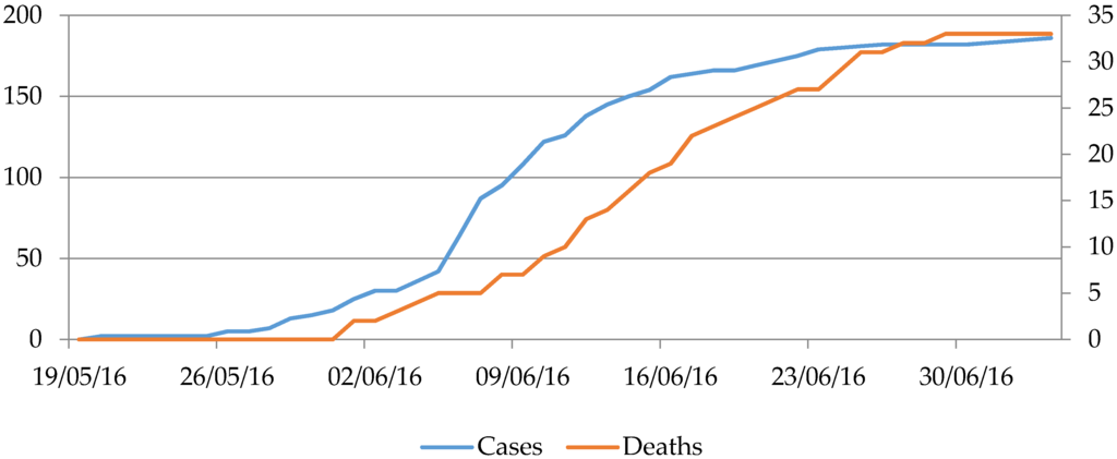 An outbreak of Middle East respiratory syndrome coronavirus (MERS) in South Korea began in May 2015. The outbreak started when a single male from South Korea who had traveled to the Middle East returned and transmitted the infection to the Korean population, in what became the largest outbreak of MERS outside the Middle East. The death toll from the outbreak was 36, with 186 confirmed cases; more than 6500 people in the country were isolated for the possible exposure to the disease. The last new case was reported on 5 July, and the last (36th) death from MERS was announced on 10 July. Figure 1 presents the number of deaths and confirmed cases [].