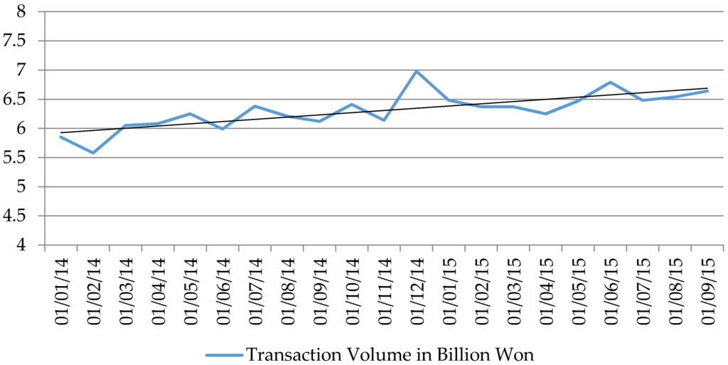 Beyond the growth in transaction volumes in 2014 and 2015, another noteworthy point in Figure 2 is that there was high variability around the Christmas holiday, followed by a considerable drop in January. This clear pattern in our data from South Korea is consistent with common behavioral patterns found in other parts of the globe []. In particular, in December 2014, the transaction volume was 7.71% and 13.68% higher, respectively, than in November 2014 and January 2015. We also took this holiday effect into account when evaluating the impact of the MERS outbreak in Korea and explicitly addressed the time trends in our empirical analysis.