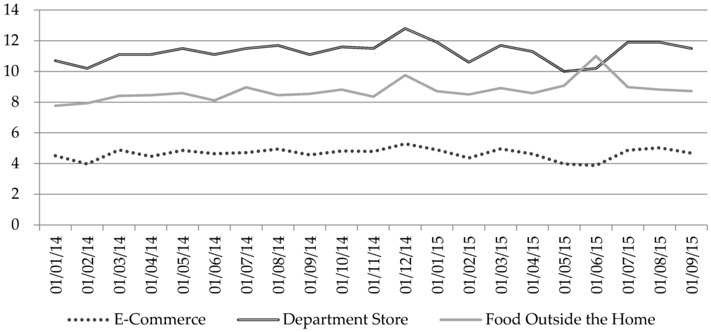 Among nine categories defined by the data provider, we restricted our attention to three that were appropriate for comparison. In particular, we chose two categories that customers would be likely to associate with the risk of contagion and one category that they would not. Figure 3 summarizes the changes in consumer expenditures in these categories between 2014 and 2015. Interestingly, across categories, consumer expenditures exhibited significantly different patterns. Consumers reduced their expenditures at department stores and on food outside the home. By contrast, e-commerce expenditures dramatically increased in May and June of 2015.