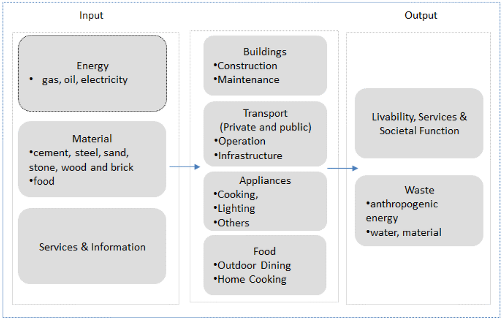 An urban metabolism conceptual framework is set up to describe the metabolism flows. The set of input and output flows, stocks, and processes, within a clearly defined settlement boundary, comprises the settlement system. Inputs and outputs at the settlement level are calculated by integrating all the potential system-driving factors, taking into account the elements of urban form that influence sustainability from a life-cycle perspective. Three major parts of the settlement system (buildings, appliances, and transportation) are studied separately and processes within each major part are identified. The neighborhood-scale consumption of three key daily necessity consumption processes is identified: buildings operation, preparation and consumption of meals and beverages, and the use of personal and public transportation [3]. System inputs include energy, materials (renewable and non-renewable), and services; materials used during building construction were also included to quantify the inputs that enabled the basic living functions of the settlement system. Outputs are livability, services and social functions, waste generated in the construction of buildings and transport infrastructure, household waste, scrapped appliances, and private cars (see Figure 1).
