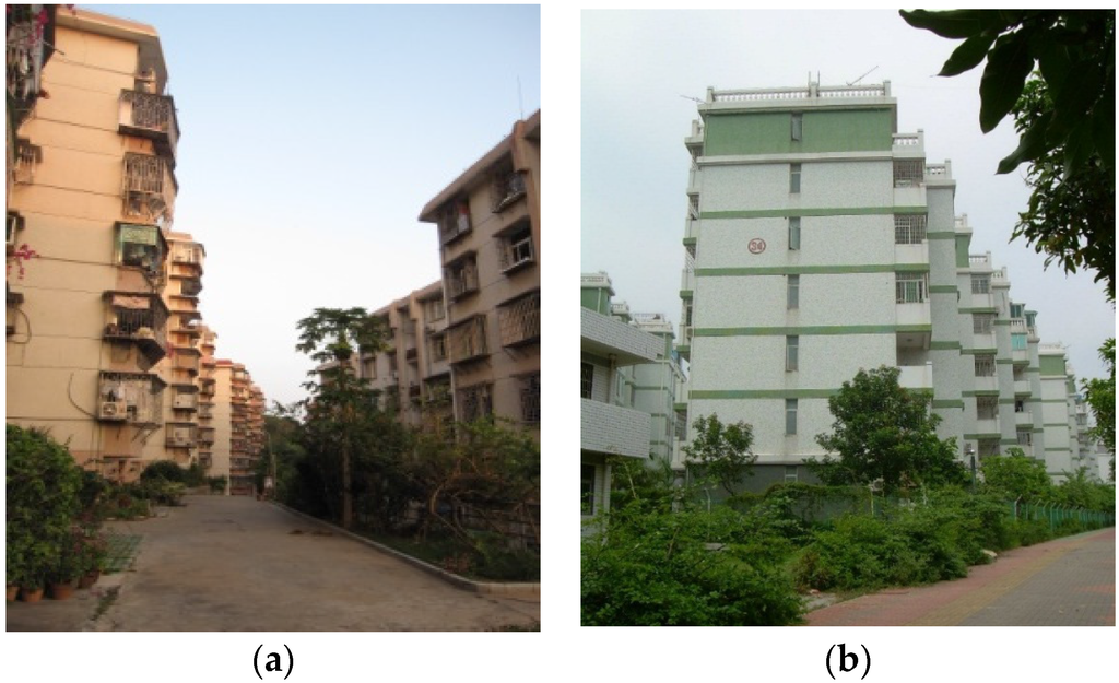As a state-owned work-unit, Xiamen University began construction on the Xiamen University settlement (XMU) in the early 1920s. The settlement was gradually reconstructed from the 1980s to the late 1990s (see Figure 2a). It consists of 159 buildings characterized with normally brick and concrete structure of pre-reform settlement in 10 subareas located around the campus (Baicheng, Haibing, Dongqu, Jingxian, Lingfeng, Qinye, Duxing, Da’nan, Guoguang, and Nan’guang). The original dormitory buildings were built before housing reform and allocated to employees without charge as housing welfare. After the housing distribution monetization system was established, they were sold to employees at low prices.