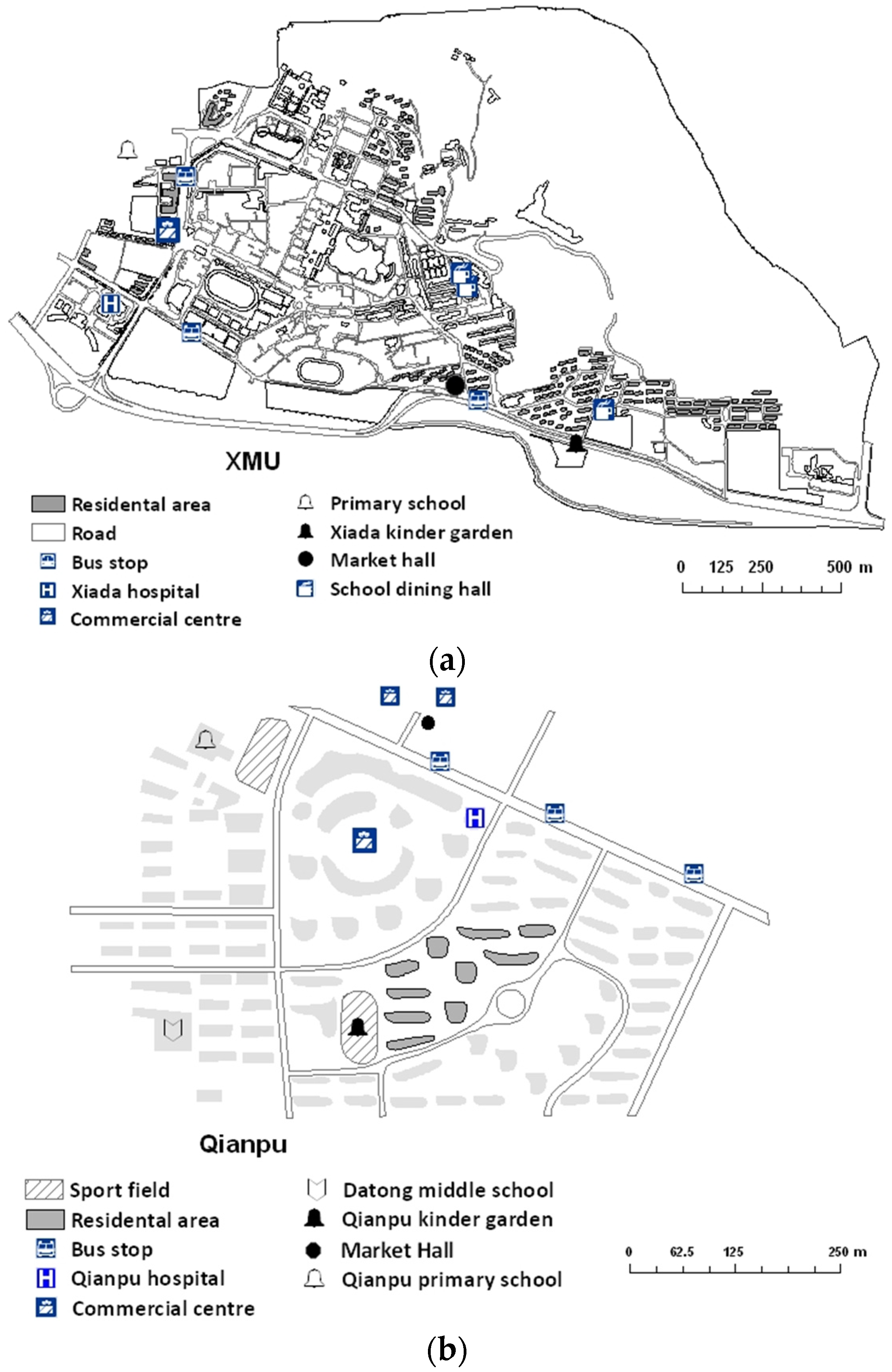 Figure 3 shows the urban form of the two settlements, including the overlay, mixed land-use functions, and buildings. In XMU, built areas (the gray “Residential area”) are laid out around the campus and preserve the low-rise characteristic, and a variety of land use functions are scattered around the campus center. Short commuting distances (surveyed average: 1.5 km) increase the percentage commuting on foot or by electric bicycle (33.5% compared with 4.4% in Qianpu settlement). Apart from the significantly greater commuting distance, Qianpu settlement has a relatively condensed mixed functional form compared to XMU settlement: diverse mixed land-use functions including kindergarten, primary school, middle school, hospital, commercial center, and wet market are all within 500 m of each other, and relatively short distances away from bus stops.