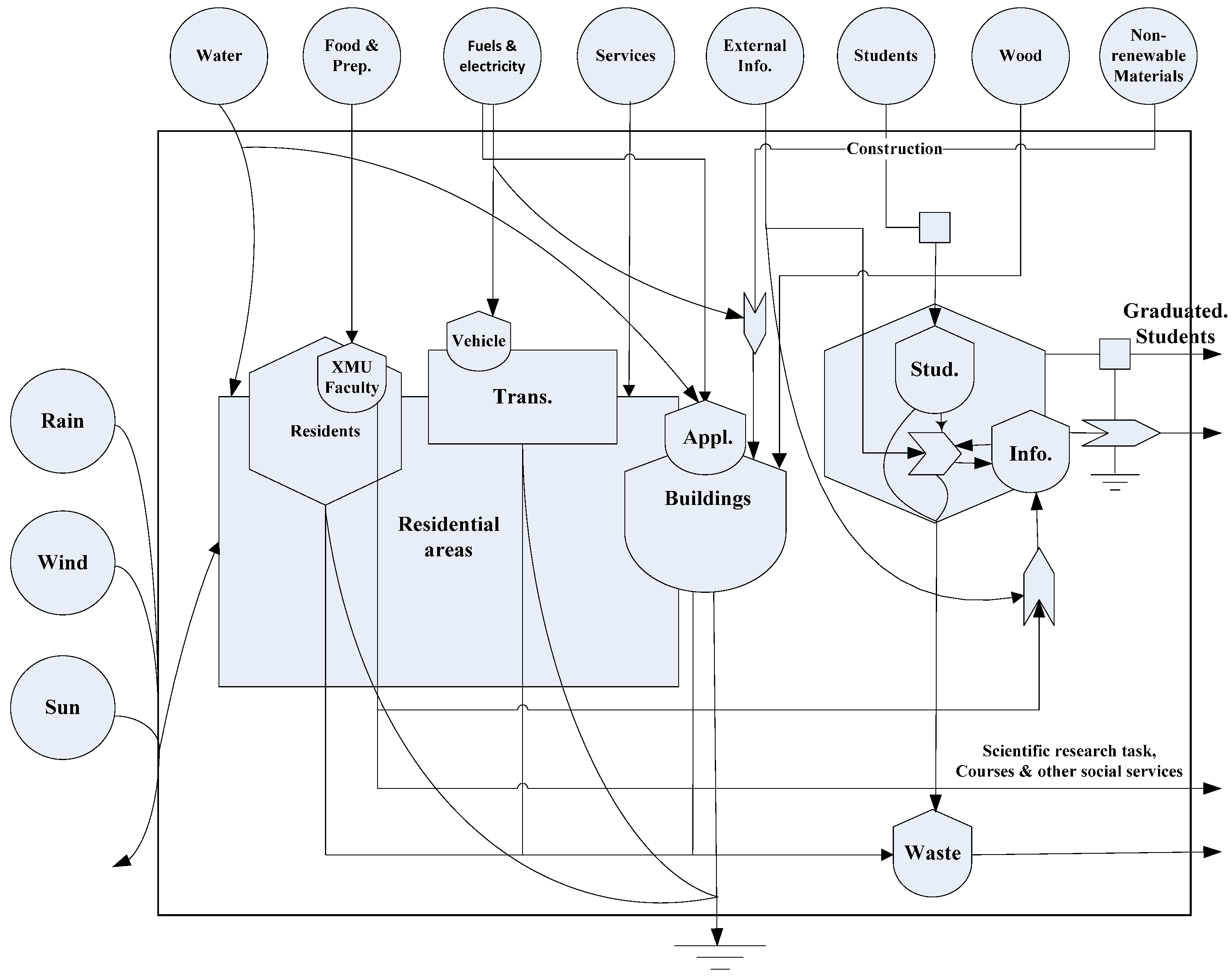 As a necessary procedure for emergy evaluation, a series of energy systems symbols were designed by Odum to represent the main ecosystem components, and provide the foundation for emergy system diagramming [31,51,58]. In the settlement system, social services and infrastructure inputs are needed to maintain settlement system operation, and the system outputs boundary are the key services (education) offered by XMU faculty residents to society.