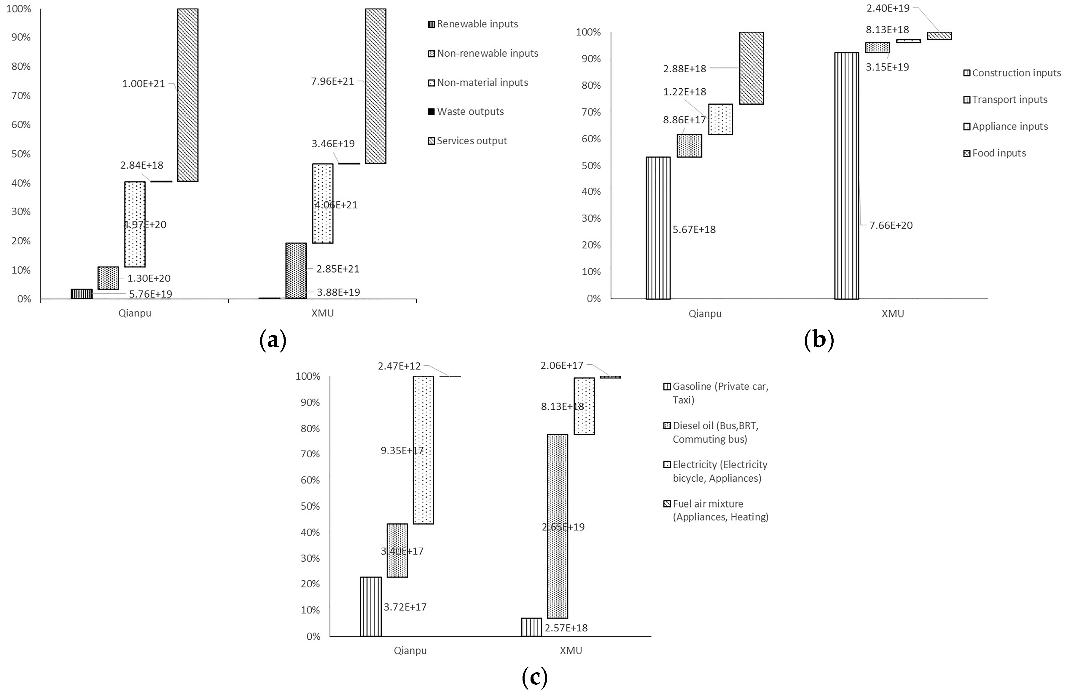 (a) Comparison of emergy flux (sej); (b) comparison of emergy flows of material input by function (sej); and (c) comparison of emergy structure of fuels and electricity energy flow (sej) in XMU and Qianpu settlements.
