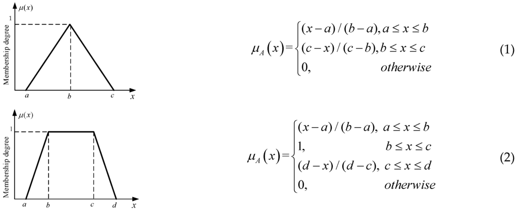 Definition 2: According to the shape of the membership function, the fuzzy numbers can be divided into several forms. The most notable types of fuzzy numbers are triangular and trapezoidal fuzzy numbers. Assume A = (a, b, c) is the triangular fuzzy number and B = (a, b, c, d) is the trapezoidal fuzzy number; the two membership functions of these two fuzzy numbers can be illustrated as Figure 1 shows.