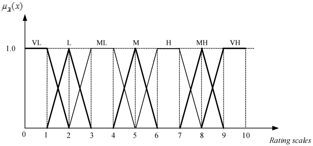 The fuzzy set theory is introduced in this part mainly to reflect the subjective judgments of decision-makers and deal with vague evaluation information [44,46]. The fuzzy set theory, introduced by Zadeh [47], has been developed and applied in many areas, especially for intelligent evaluation and decision matters. It was considered to deal with the vague and impressive cognitive human judgments on certain criteria with its mathematical advantages of membership function, especially for those variables that can be calculated or numbered by specific crisp values. The uncertain and vague information of alternatives subject to multi-criteria are quantified by linguistic variables or fuzzy numbers [46]. Based on the previous illustration, what comes next is a brief introduction to fuzzy set theory and linguistic variables.