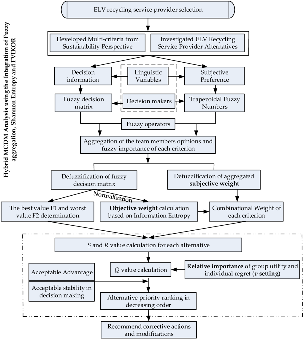 The demands of sustainability and green philosophy have resulted in some research focused on the front supply chain of the production, green suppliers and sustainable supplier selection by applying multi-criteria decision making (MCDM) methods [17,18]. However, there is little attention paid to the green practice of ELV recycling service. Therefore, recycling service provider selection is not currently the subject of much economic consideration. Furthermore, the environmental attributes of the implementation of the organization should be taken into account. Specifically, the ELV recycling service provider is a multi-criteria decision making (MCDM) issue that requires considering multiple conflicting criteria. This paper fills this gap by proposing the hybrid MCDM method, which integrates fuzzy aggregation, Shannon Entropy and fuzzy VlseKriterijumska Optimizacija I Kompromisno Resenje (FVIKOR) technique to prioritize all of the alternatives under the sustainable criteria framework. To the best of our knowledge, there are currently few studies published on ELV recycling service provider selection using hybrid MCDM methods.
