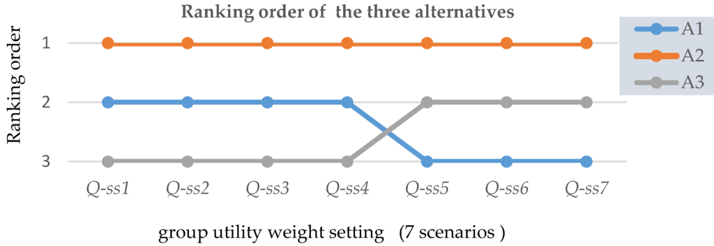 The best candidate is A2 as calculated above, while the other two alternatives show a fluctuation with the varying of the v value. As can be seen, when the decision-makers pay more attention to group utility than to individual utility (), A1 shows its advantage over A3, and vice versa.