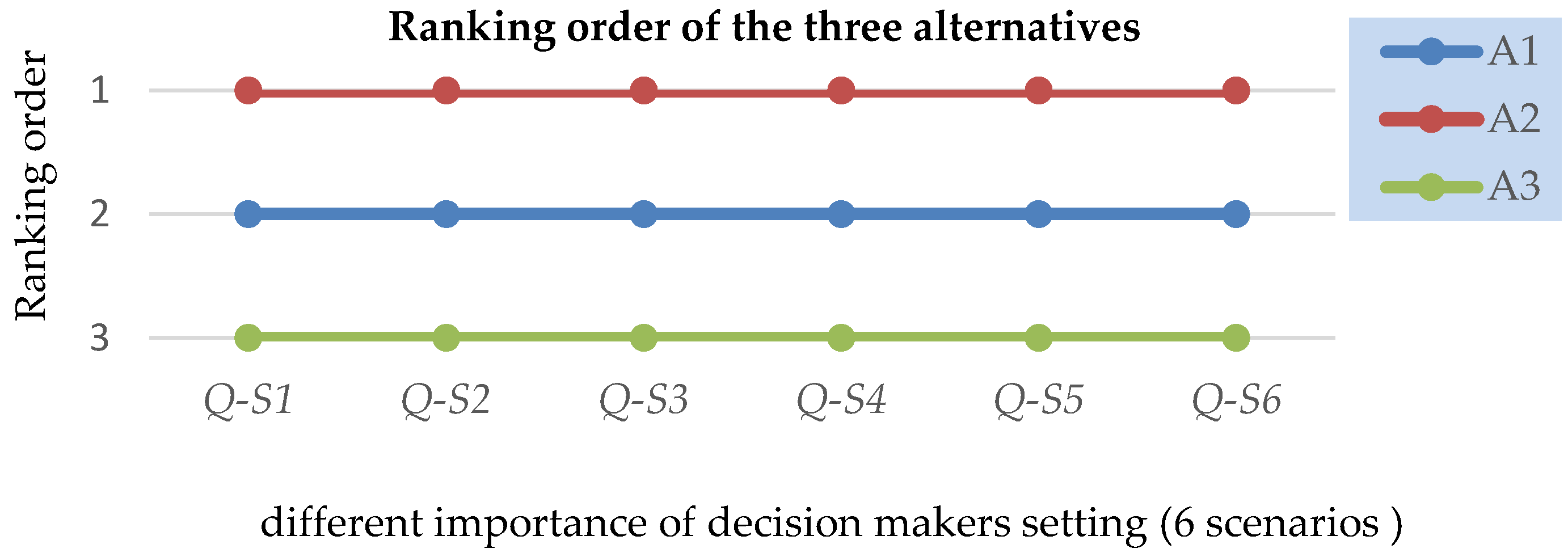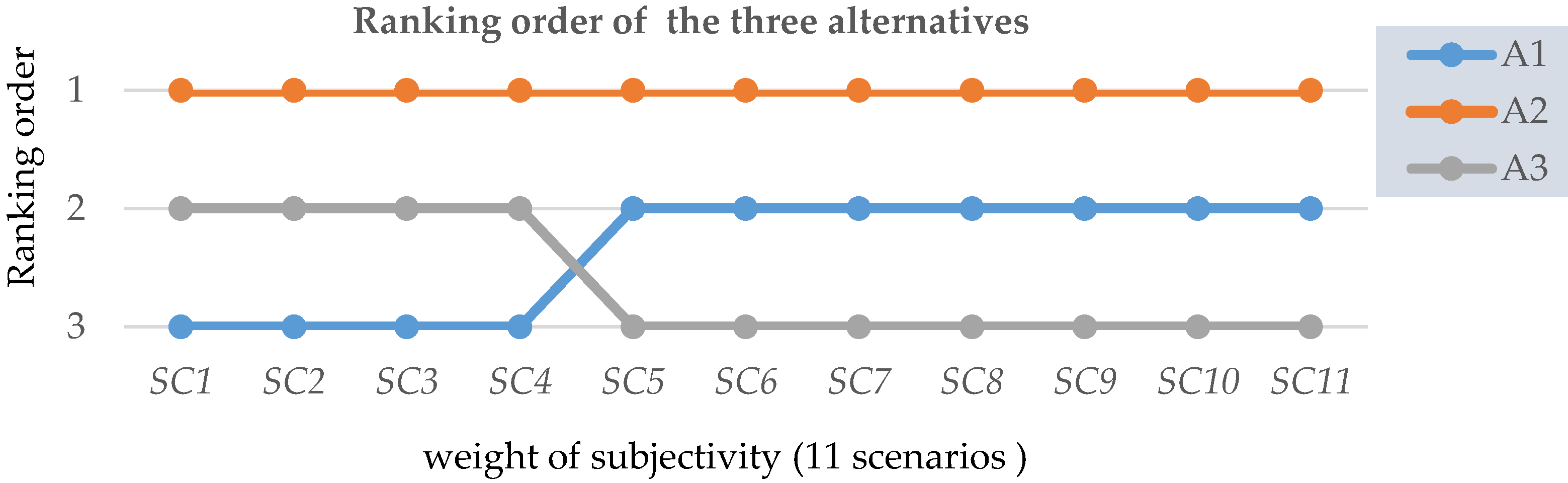 Table 11). The decision results and ranking order of the three alternatives in different scenarios are observed and addressed in the next section.