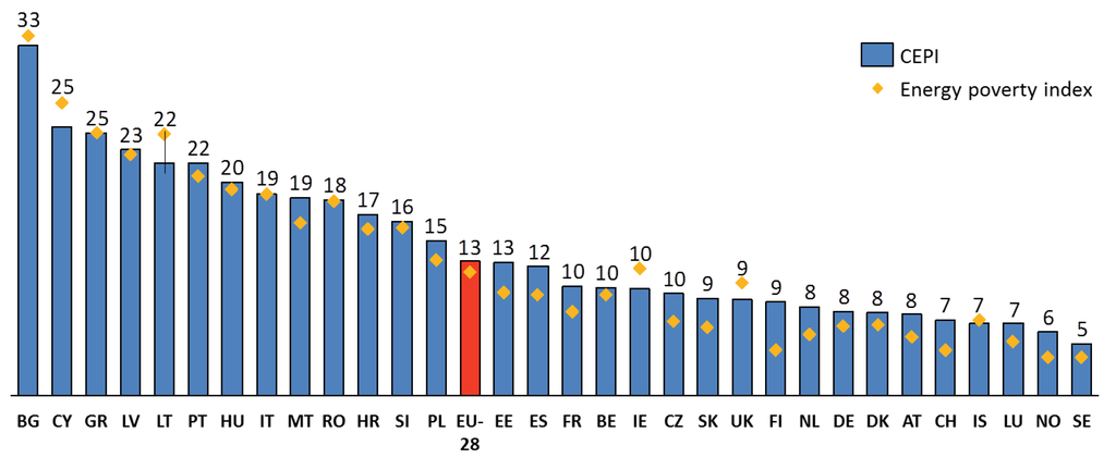 Given that several European states are attempting to assess the severity of the issue and address it by providing support to those most affected, our initial focus was set on designing an instrument that can help in this regard. The result was the Compound Energy Poverty Indicator. This tool builds upon existing research, but provides a more complete and complex evaluation of energy poverty at the national level. The results revealed that the hierarchy of energy poverty illustrated by (Tirado Herrero and Bouzarovski [44]) remains somewhat stable, but is finely adjusted through the inclusion of additional indicators of inadequate living conditions. Eastern European, as well as some Southern, EU member states are the most affected by energy poverty, while countries like Sweden, Luxembourg, Norway and Austria are the least affected. While providing a standardized measurement of energy poverty across Europe, CEPI does have some limitations that need to be taken into consideration, such as not being able to account for ‘hidden’ incidences of energy poverty and using a standard weight for the lack of adequate cooling/heating irrespective of the specific national climate.