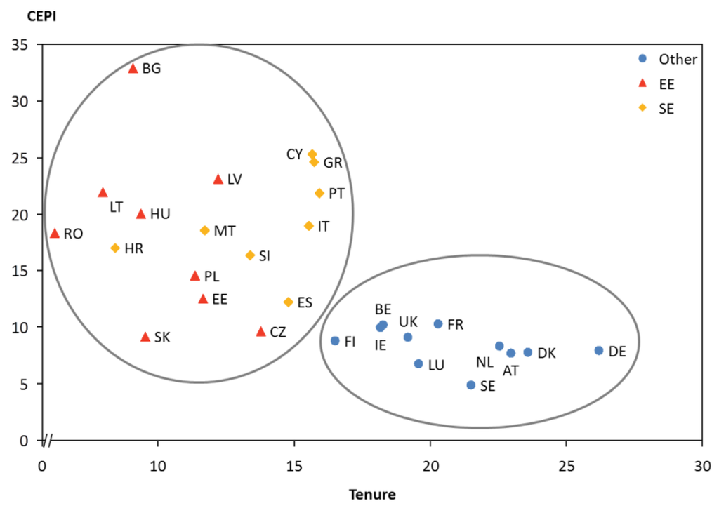The negative correlation between Tenant and CEPI is also counterintuitive and suggests that EP is higher in countries where the share of population that rents homes is low. After further exploring this issue, we have determined that a geographical clustering exists within the CEPI–Tenant relationship in the sense that countries from Southern and Eastern Europe (for the purpose of this analysis, “Eastern Europe” includes those countries which were part of the USSR or under its sphere of influence) tend to have both a lower Tenant score and a higher CEPI score. An illustration of the clustering is provided in Figure 2.