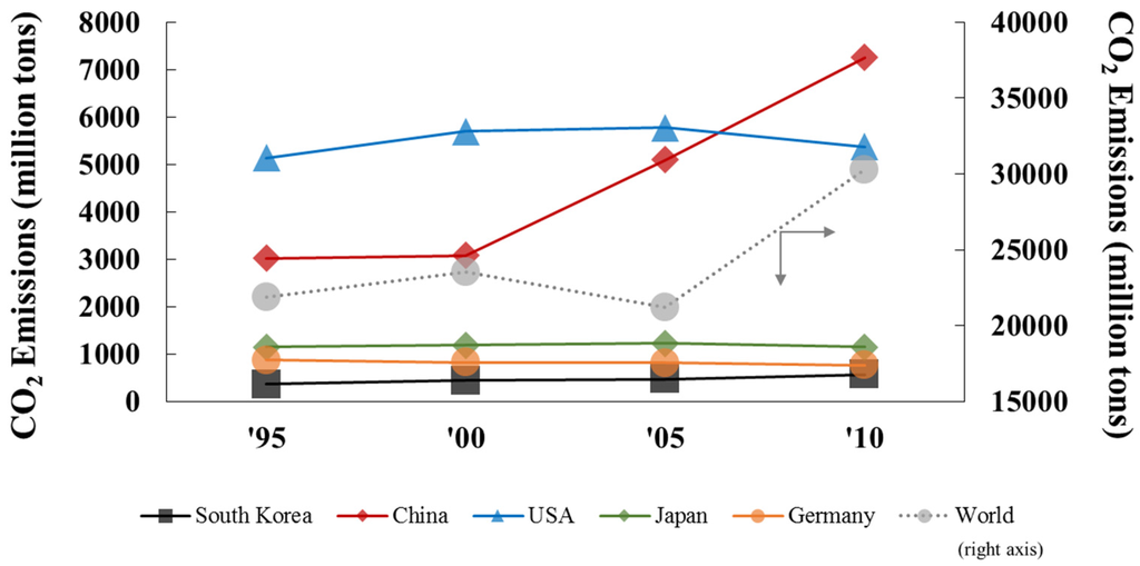 The total amount of CO2 that was emitted by the five major industrial countries is shown in Figure 1; these emissions reflect the available data between 1995 and 2010 in five-year intervals. The total CO2 emissions from the use of various energy sources were obtained from available data from the International Energy Agency (IEA) [4]. According to the IEA, the total CO2 emissions according to the energy sources are divided into five main groups, namely, coal and peat, oil, natural gas, recycled gas, and electricity. A rapid increase in the amount of CO2 emissions in China is observed from 2000 onwards. This significant increase in CO2 emissions seems to correlate with the economic boom in China, which experienced an 8%–13% annual increase in economic growth beginning in 2000.