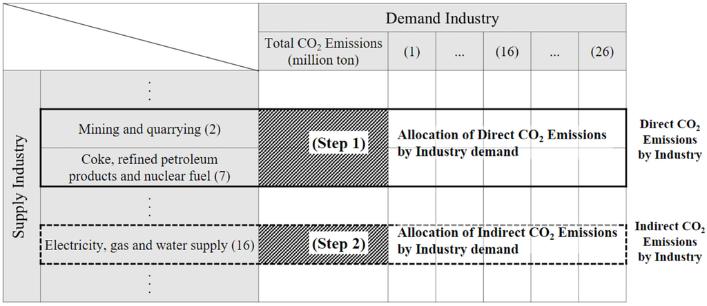 In this study, the CO2 emissions were first subdivided into the energy sources of coal/peat and oil, for which the direct CO2 emissions to the respective industry sectors were estimated from the distribution structure of these energy sources throughout these industry sectors. Because the CO2 emissions from recycled and natural gas were comparatively lower than the previously mentioned energy sources, they were not analyzed in this study. The “mining and quarrying (2)” industry corresponded to the production and manufacture of the energy source coal/peat, whereas the “coke, refined petroleum products and nuclear fuel (7)” sectors corresponded to the energy source oil. As shown in Figure 2, the direct emissions of each industrial sector are illustrated in (Step 1) and the indirect emissions are shown for each industrial sector in (Step 2), based on the direct emissions from the “electricity, gas and water supply (16)” sector.