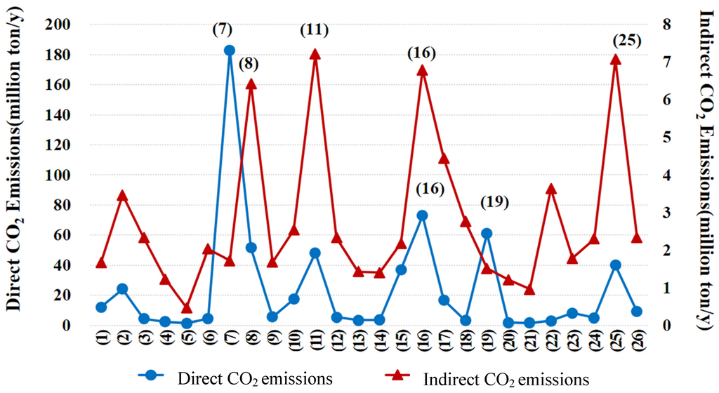 The direct CO2 emissions from each industry sector were estimated by the proportion of energy sources, such as coal/peat and oil, utilized per industry sector in the input–output table. The total amount of CO2 that is directly emitted by the “electricity, gas and water supply (16)” sector is utilized to estimate the indirect emissions of each industry sector according to the distribution of the supplied commodity of the “electricity, gas, and water supply (16)” sector across the remaining industry sectors within the input–output table, as previously described in Step 2. As a result, the top five total CO2-emitting industry sectors, including both direct and indirect emissions, have been identified in top-down order as “coke, refined petroleum products and nuclear fuel (7)”, “electricity, gas and water supply (16)”, “transport and storage (19)”, “chemicals and chemical products (8)”, and “basic metals, fabricated metal products, with the exception of machinery and equipment (11)”. If direct and indirect emissions are considered separately, the rank of direct CO2 emissions also follows the same order; however, the rank of indirect CO2 emissions was determined to be in the order of “basic metals, fabricated metal products, with the exception of machinery and equipment (11)”, “public administration and defense, compulsory social security, health and social work (25)”, “electricity, gas and water supply (16)”, “chemicals and chemical products (8)”, and “wholesale and retail trade, repairs (17)”. Figure 3 provides the amount of CO2 that is emitted across the industry sectors in units of million tons, which is the average value of four time series data sets, namely, 1995, 2000, 2005, and 2010.