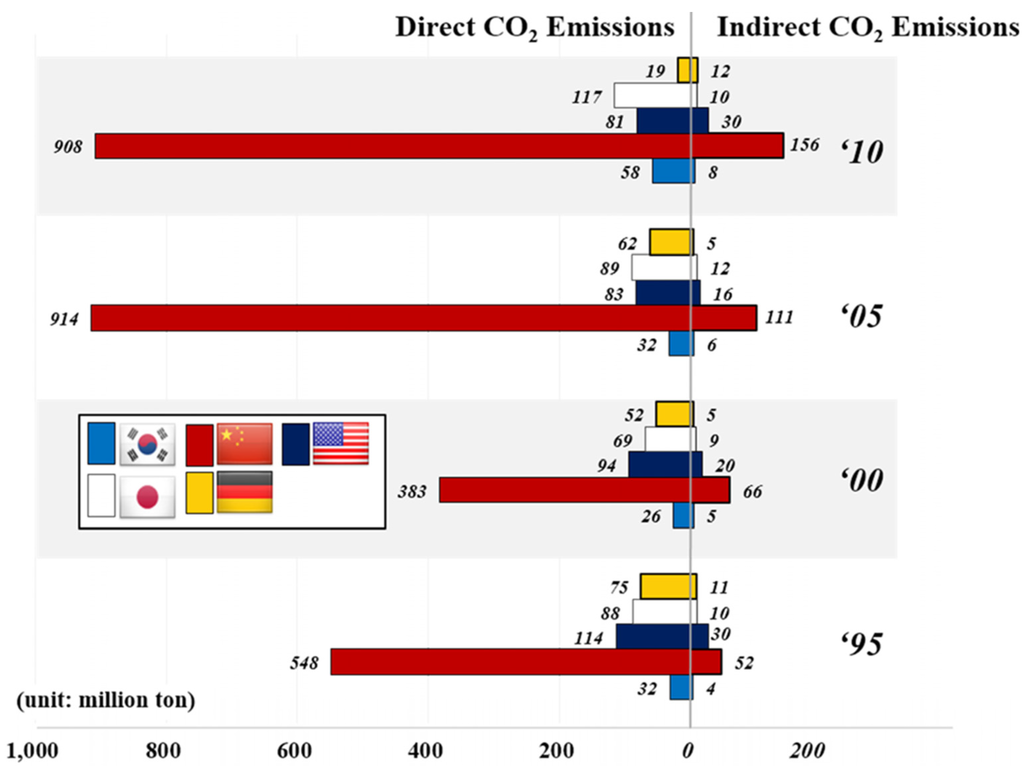 In this study, the amount of direct and indirect CO2 emissions by the basic metals-producing countries, including Korea, China, USA, Japan, and Germany, have been analyzed using the input–output table. The above-mentioned countries are the Top 5 steel producers with a cumulative 68% of the global steel production in 2014. China, Japan, USA, Korea, and Germany produce 49%, 7%, 5%, 4%, and 3% of the global steel, respectively [9]. Although Russia in 2014 did produce slightly higher amounts of steel than Korea, past data for Russia were incomplete and unreliable, thus Russia was excluded within this study. The steel industry is considered to be one of the largest emitting industries of CO2 and has been chosen as the reference to compare other industries through the input–output table. In addition, this study aimed to indirectly identify the potential impact of the technological efforts the steel industry has made and will make with lowering CO2 emissions and in the mid to long term be utilized in providing valuable data for carbon emissions trading policies.