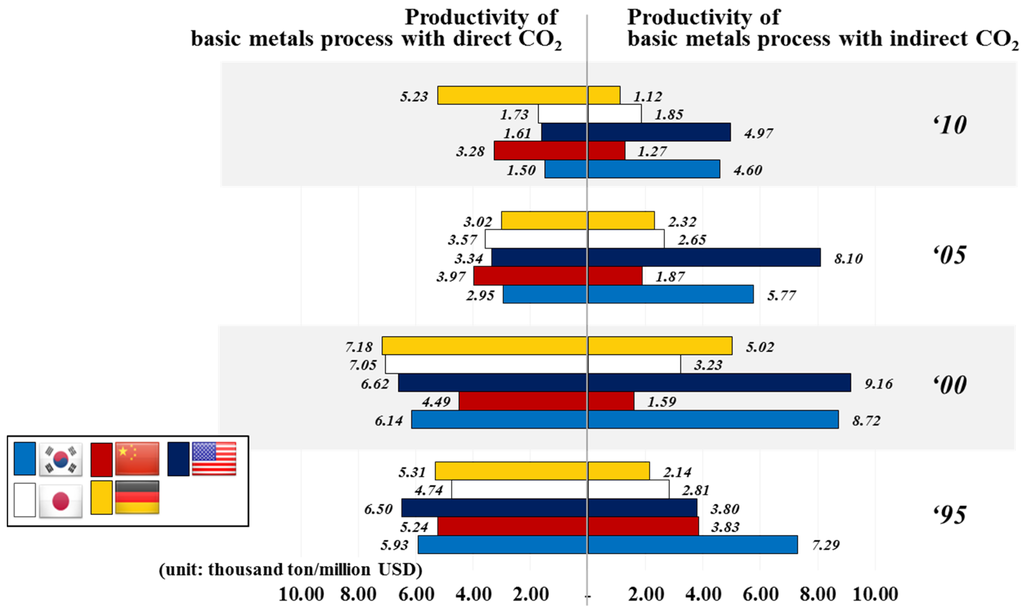 Thus, it would seem that the direct emissions levels of Korea, China, and Japan are increasing along with the indirect emissions, except for Japan. This trend is correlated with the amount of steel and the non-ferrous basic metals that are produced and the dominant production route for a particular country. China, Korea, and Japan experienced production increases within the integrated steel route that utilizes coal/peat and oil as its major energy source, which yielded direct CO2 emissions. The utilization of coal and oil energy sources is speculated to be pulverized coal injection (PCI) into the blast furnace or the supplemental heat via coal or oil heating within the various steelmaking processes. Steel production by the EAF route also expanded within the time scale that was identified in this study, which generates higher amounts of indirect CO2 emissions. In addition, China experiences significant increases not only in steel production, but also in its non-ferrous sector, which is more energy-intensive per ton of metal compared with steel. Countries, such as the US, that are heavily concentrated towards the EAF route and non-ferrous metals production, in which electricity is the main energy source, will experience continued increases in indirect CO2 emissions. Therefore, the scheme of direct and indirect CO2 emissions in the basic metals industry is closely related to the dominant process route that is taken by the respective countries and the production amounts of major non-ferrous metals, including Al, Cu, and Zn. Figure 5 shows the productivity of the basic metals process with direct and indirect CO2 emissions. The productivity represents the amount of produced basic metals in thousand tons with direct and indirect CO2 emissions divided by the energy costs in US million dollars. In 2010, Germany had the highest productivity of basic metals, with direct CO2 emissions of 5.23, whereas Korea had the lowest productivity of 1.50. This estimate is likely to be related to the increase in the cost of energy for Korea with respect to the other countries. For the productivity of basic metals with indirect CO2 emissions in 2010, the US had the highest productivity of 4.97, whereas Germany had the lowest productivity of 1.12. The lower value for Germany suggests a significant change in the amount of produced basic metals with respect to the other countries.