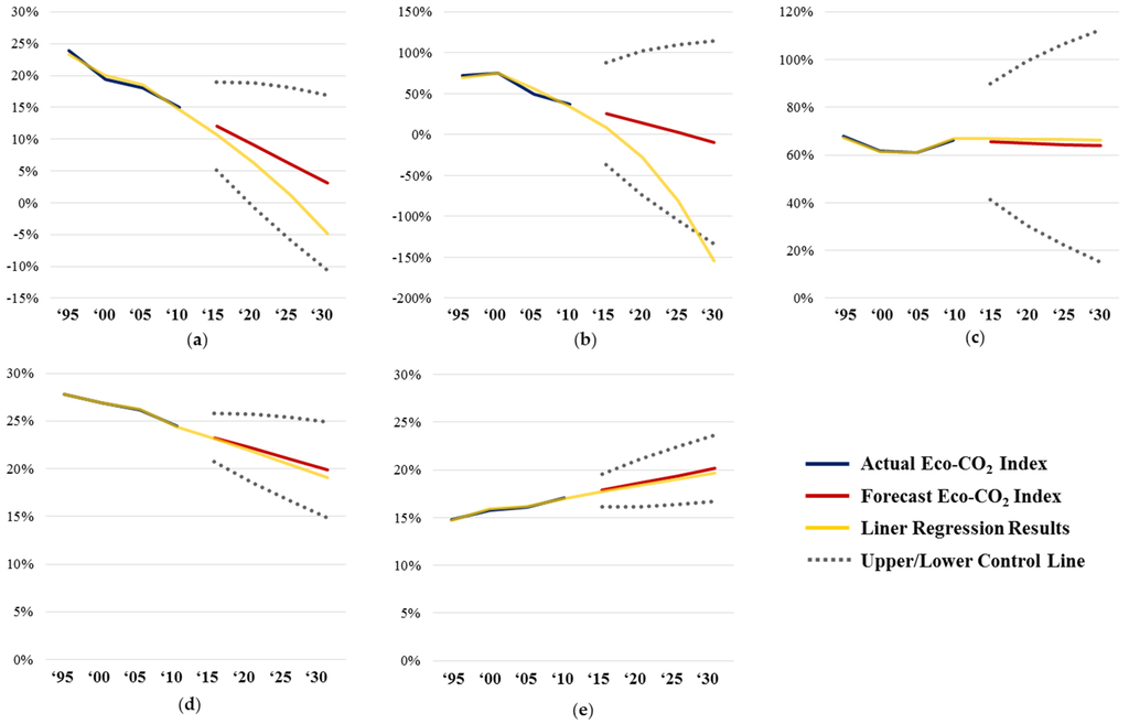 Eco-CO2 Index with the estimated forecast using the ARIMA model up to 2030. (a) South Korea; (b) China; (c) USA; (d) Japan; (e) Germany.