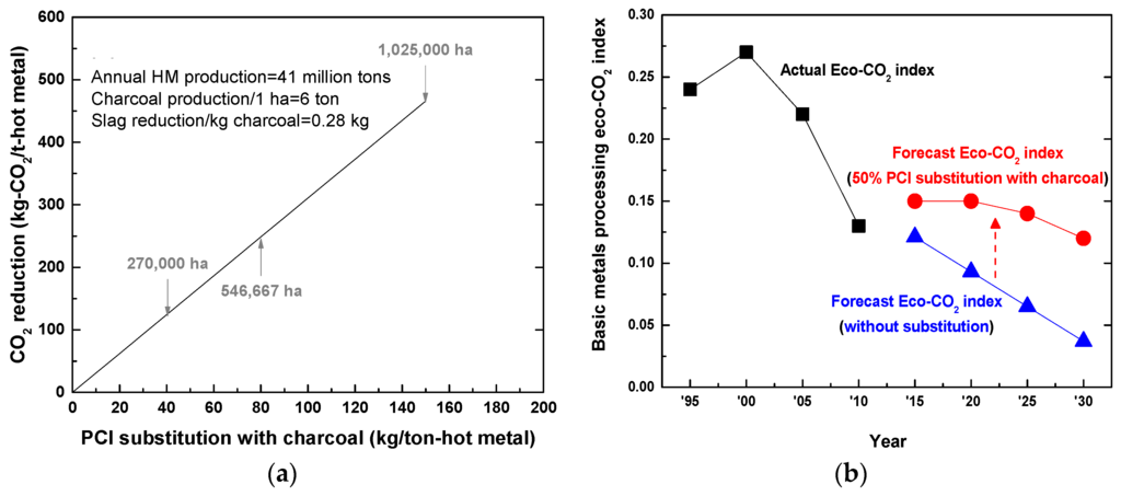 If the PCI in the BF is substituted with the carbon neutral bamboo charcoal, which has similar calorific value of approximately 3000 kcal/kg, 150 kg-coal/ton-hot metal could be replaced. These changes would cause a potential decrease in CO2 of approximately 440 kg-CO2/ton-hot metal. In addition to the substitution by the carbon neutral charcoal, acidic oxides of SiO2 and Al2O3 of approximately 18 kg/ton-hot metal will also decrease. Because the fluidity of the slag in the BF must be maintained by the addition of CaO at a fixed CaO/SiO2 ratio of approximately 1.3, the substitution by charcoal will decrease the slag amount by 41.4 kg/ton-hot metal. This decrease in slag amount will subsequently decrease the carbon that is consumed in the BF by approximately 7 kg/ton-hot metal, which would correspond to 26 kg-CO2/ton-hot metal. Thus, the substitution of the PCI with bamboo charcoal would correspond to a decrease in the CO2 emissions in the blast furnace by 466 kg-CO2/ton-hot metal. According to WSA statistics [9], 41 million tons of total hot metal were produced in Korea in 2013, which represents an annual CO2 reduction of approximately 19 million tons. Figure 7a estimates the possible CO2 reduction from the substitution of PCI in the BF with various amounts of bamboo charcoal. Using the ARIMA model and assuming a 50% substitution of the PCI with bamboo wood charcoal and a neutralization capacity of 38 ton-CO2/ha, the effect of bamboo wood charcoal for the basic metals CO2 neutralization was forecasted to 2030 using the ARIMA model. The average increase in CO2 emissions of the basic metals industry during the forecasted time range to 2030 was 10% on average based on the emissions between 2010 and 2014; this estimate was employed for the forecasted values applied in the ARIMA model. The results in Figure 7b indicate that the large slope of the decrease in the eco-CO2 index has been significantly deflected and the neutralization ability can be maintained at approximately 13% in 2030, even with the expected industry expansion forecasted by the ARIMA model by substituting PCI with bamboo wood charcoal and the bamboo farming of 50,000 ha.