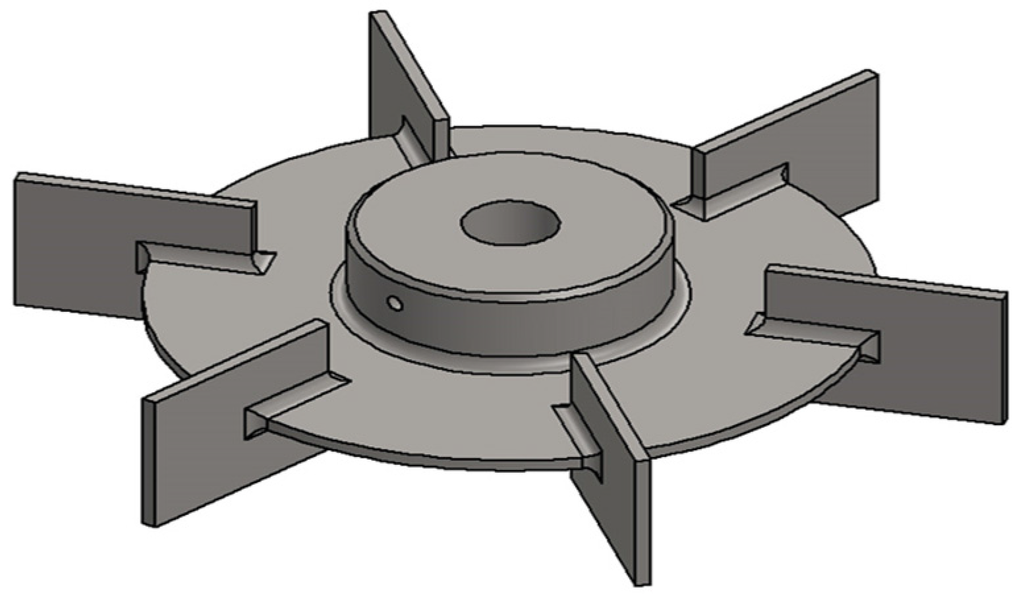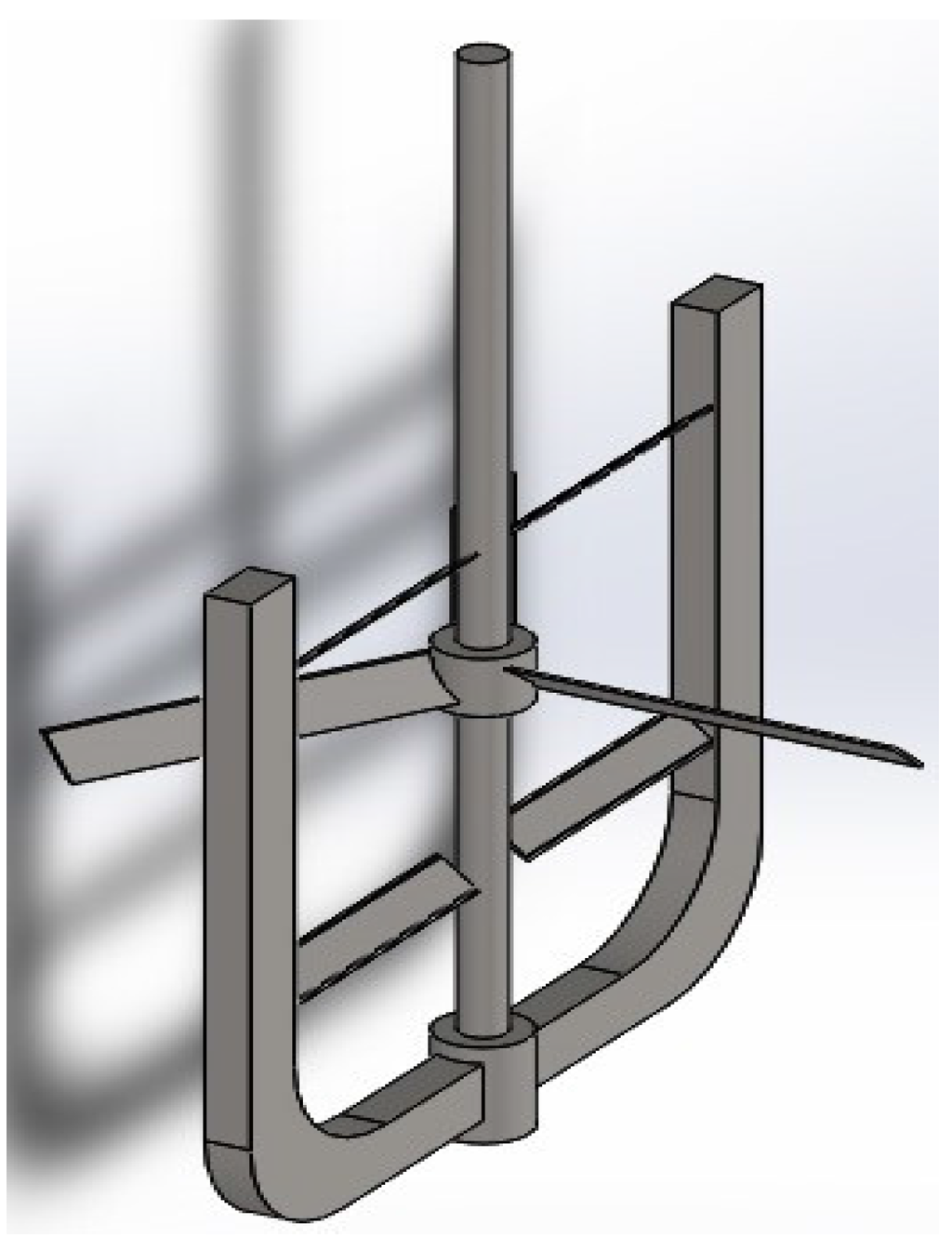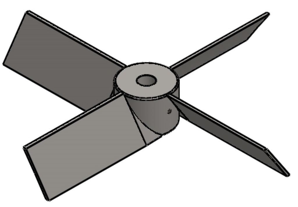 Figure 1 shows a typical set-up with the impeller for agitation of food waste. Material selection for the impeller shaft is based on two distinct factors, torque and bending moment, and the critical speed of the impeller shaft. The various impeller configurations investigated are modeled using Solidworks CAD software, as shown in Figure 2, Figure 3, Figure 4 and Figure 5. The governing equations for the transport of the moisture-rich food waste are approximated using the continuity, momentum and the energy equations with the continuum assumption.