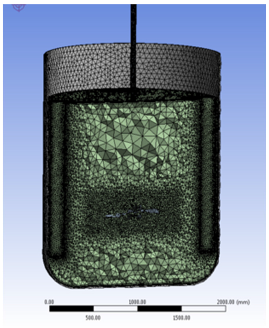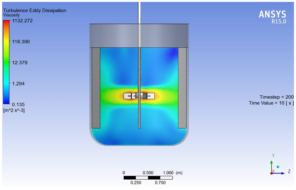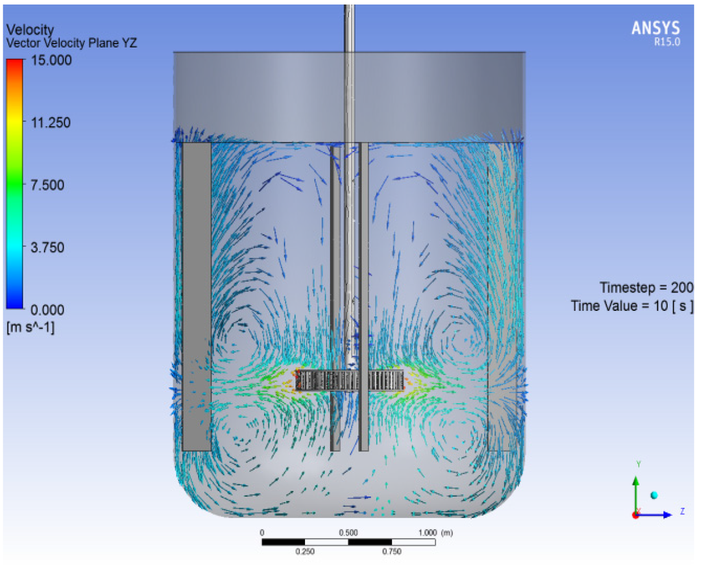 Computational fluid dynamics (CFD) provides a flexibility and an inexpensive way of examining the impact of modifying vessel configuration and dimensions, impeller orientation and rotational speed, and fluid properties. Abbaszadeh et al. [12] employed a combination of the finite element method (FEM) and an analytical technique in the design of mixing systems in a stirred tank reactor for bio-diesel production. The design was based on a Pitched Blade turbine down flow with two inclined blades (45°), assuming maximum working conditions. The mixing power, mechanical design and stress analysis of the agitator were captured as source terms within the FEM models. The results showed a similarity between the analytical and modal analysis of the critical rotational speed of the mixing shaft, with basic dimensions and materials considered for the design of the mixing system in acceptable range. Asiri et al. [13] proposed designs for differential agitators and implementation methods in order to maximize agitation. A parametric study and shape optimization, for various material properties and loading conditions, was carried out with numerical analysis. Using ANSYS, the optimum design for the geometrical parameters of the differential agitator elements were obtained, while the performance of a normal agitator was compared with the differential type. It was observed that the differential type agitator exhibited better homogeneity.