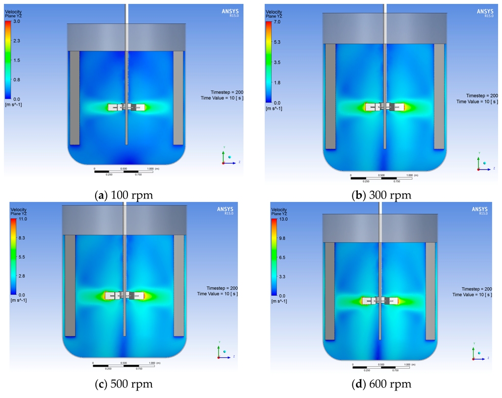 Velocity contour profiles for Pitched Blade impeller homogenizer in YZ plane, for six impeller rotational speeds.