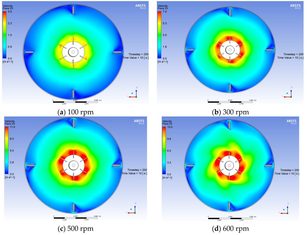- Chara, Z.; Kysela, B.; Konfrst, J.; Fort, I. Study of Fluid Flow in Baffled Vessels Stirred by a Rushton Standard Impeller. Appl. Math. Comput. 2016, 272, 614–628. [Google Scholar] [CrossRef]