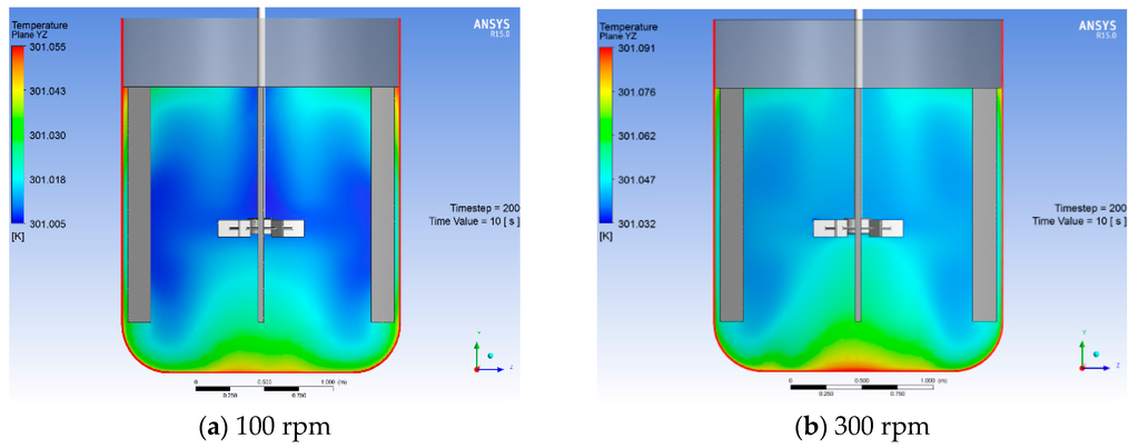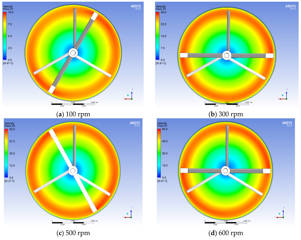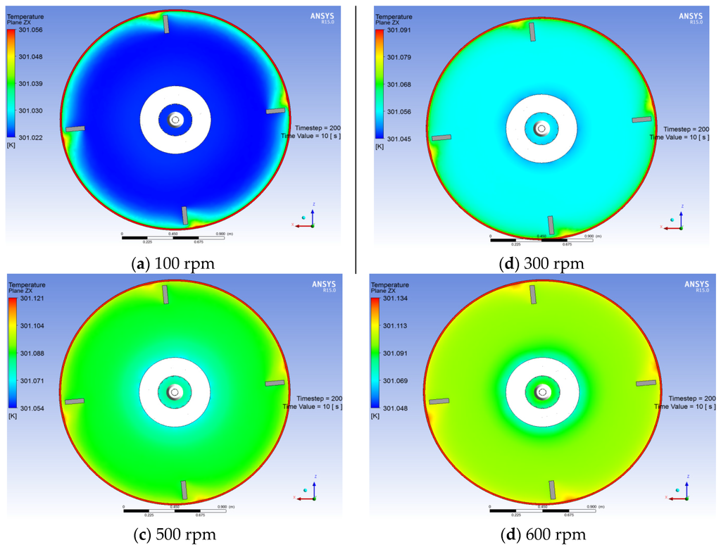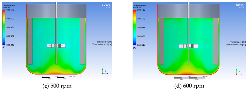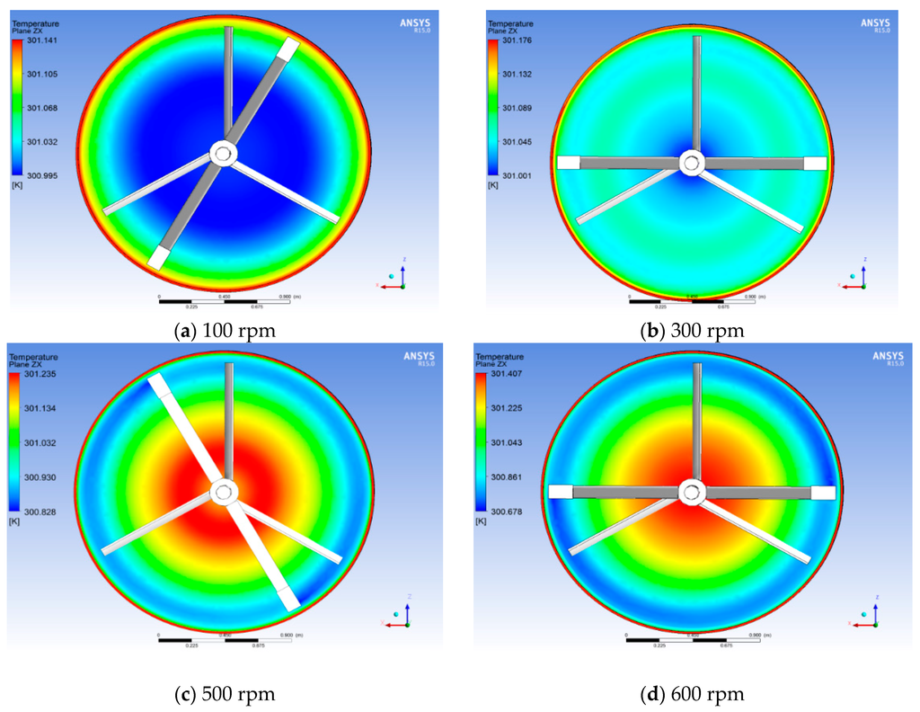 Temperature distributions within Pitched Blade impeller homogenizer in ZX plane, for six impeller rotational speeds.