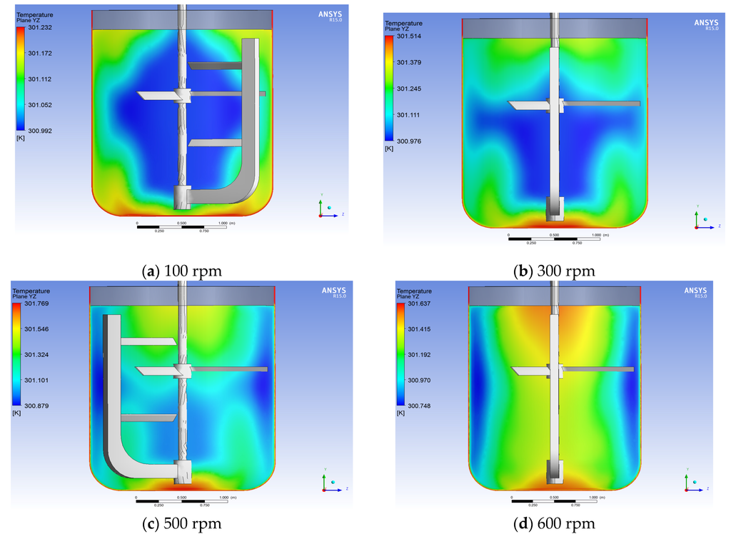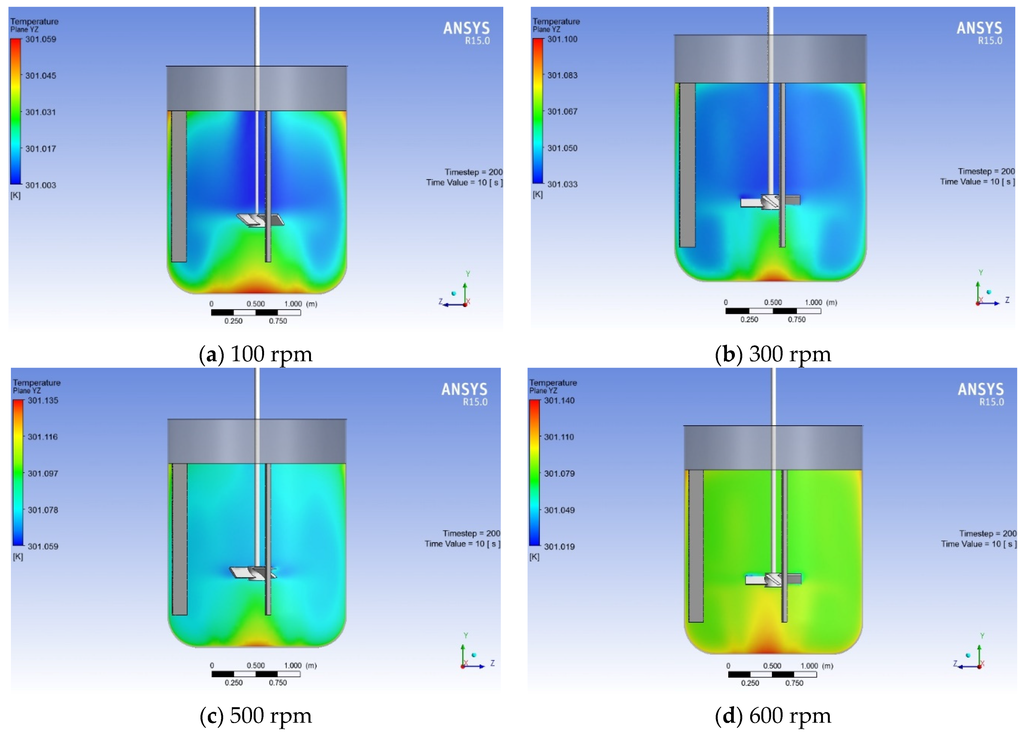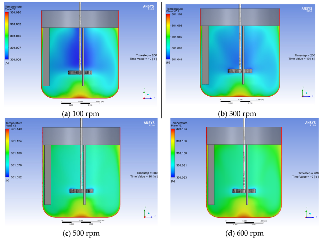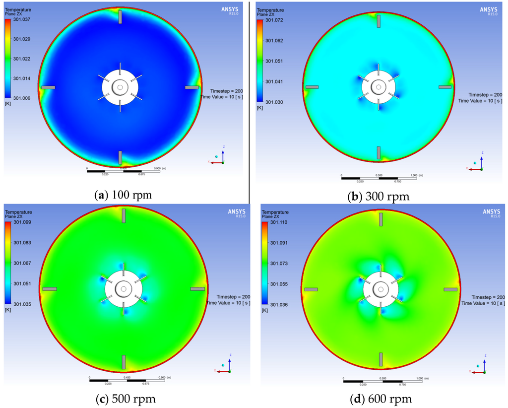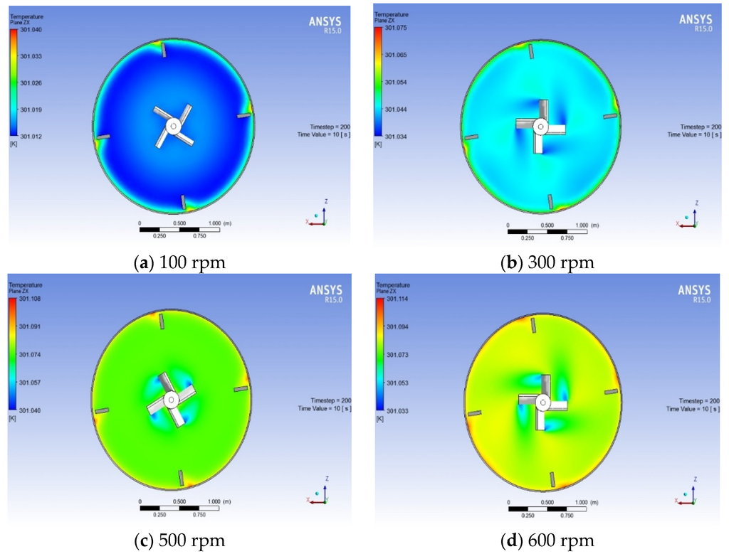 Heat dissipation from the homogenizer vessel wall to the fluid domain within the Rushton impeller homogenizer increases as the impeller rotational speed increases from 100 rpm to 600 rpm, as seen in Figure 12 and Figure 13 (increases from a to d). The legend on the left hand side of the plot show the extent of heat dissipation from the homogenizer vessel wall by a gradual temperature rise of 0.04% (0.132 K) to the fluid domain, which is at an initial temperature of 301 K. This indicates that the food waste is constantly heated at a temperature of 333 K. The steady state flow field is visually displaced in Figure 13, which shows the temperature distribution in the ZX plane. The blue region around the impeller in the homogenizer indicates the “dead zones”, where heating and mass transfer of fluid are poor (especially predominant in Figure 13a) .
