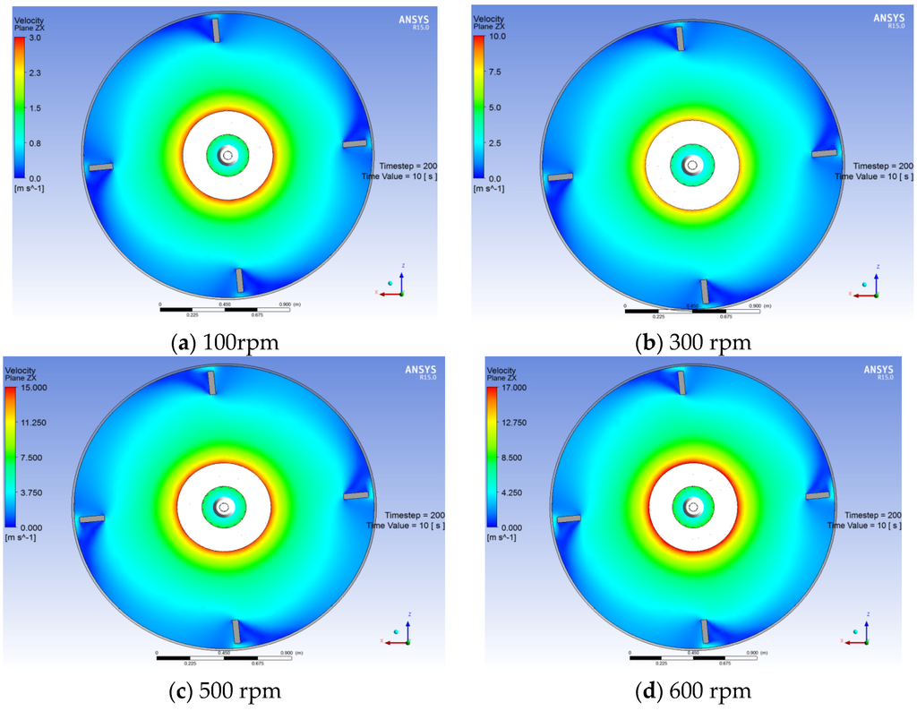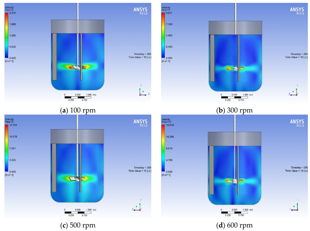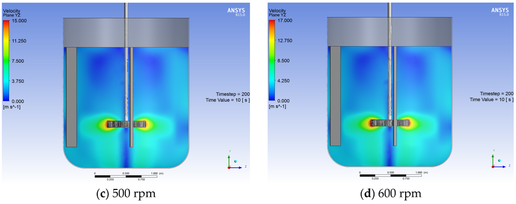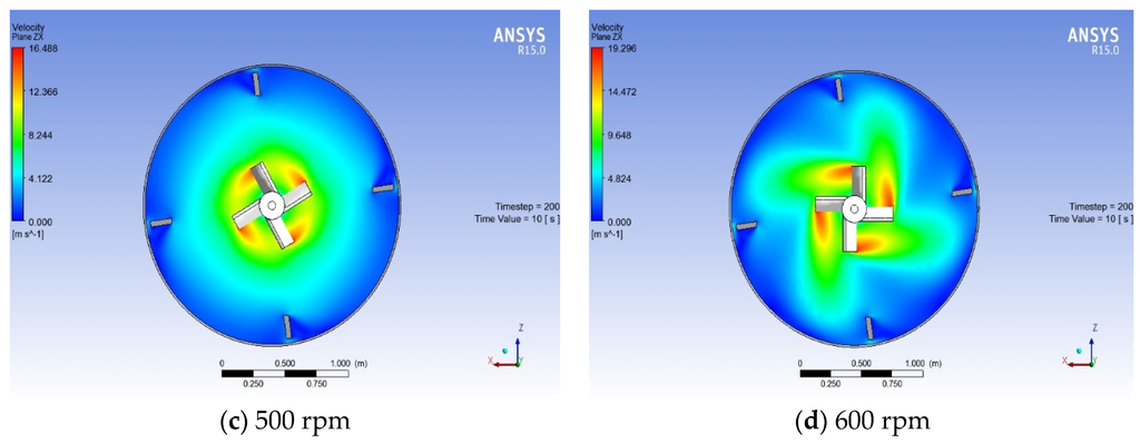 The primary circulation loop increases as the impeller speed is varied from 100–600 rpm as can be clearly seen from the velocity profile plots in Figure 10 and Figure 11 indicating well stirred regions (cavern) near the impeller and stagnant zones elsewhere in the homogenizer vessel. The solution domain in Figure 10 shows where the diffusive effect (mixing) is greatest (increases from a to d) in the area swept by the impeller (cavern) and least at the bottom and top parts of the homogenizer vessel tank. Figure 11 shows the strong interaction between the impeller (increases from a to d), the fluid and the baffles interfaces in the ZX plane of the homogenizer. The circulation loop around the Rushton impeller tip increases gradually from 100–600 rpm. This result suggest mass movement of the fluid (mixed zones) around the impeller, which arises as the impeller rotational speed is increased.