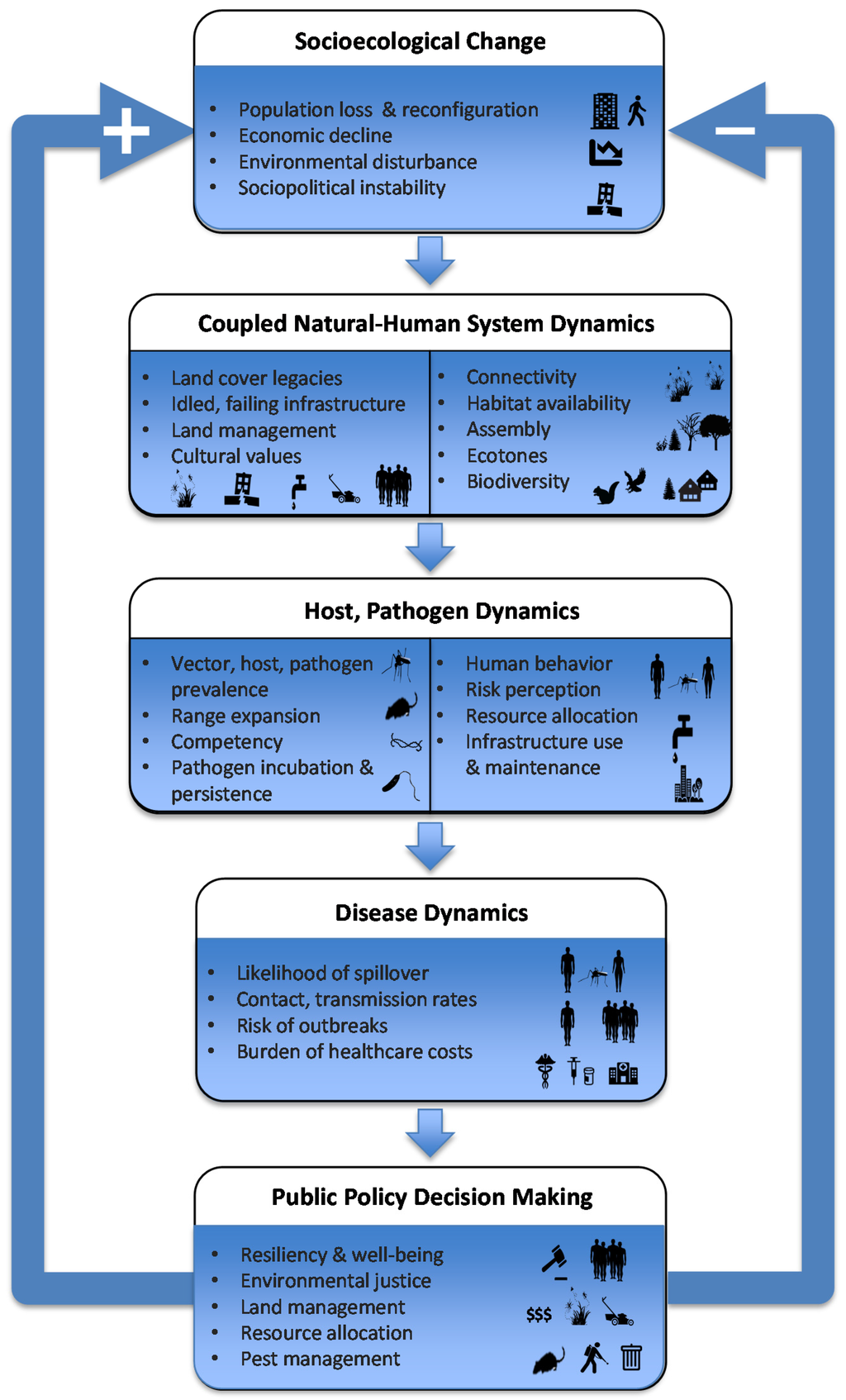 | West Nile Neuroinvasive Disease, Dengue Fever and Chikungunya | West Nile Virus, Dengue Virus and Chikungunya Virus | Vector; mosquito (Culex spp., Anopheles spp.) | Mammals, birds | Increased breeding habitat through standing water in abandoned tires, pools of water associated with land use change and demolition, abandoned swimming pools | Increased abundance of mosquito vectors | [85,110,111,112,113,114,115] | North America |