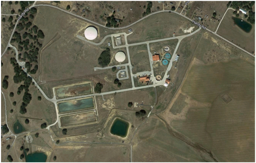 An aerial photograph of The Twin Oaks facility. Pictured are storage tanks, cascade aerators, dual media filters, solids contractors, and settlement ponds. Much of the surrounding farmland around Twin Oaks is also owned by SAWS (Imagery and Map Data, [43]).