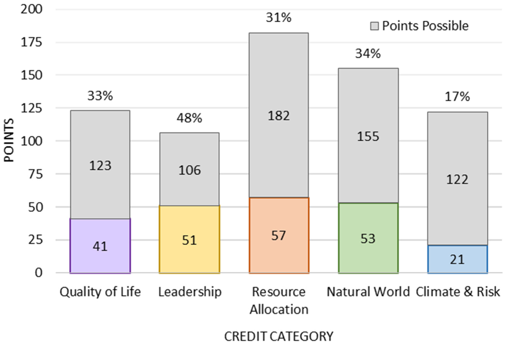 Table 7 and Figure 3 show the ratings given by the authors for the Twin Oaks facility in each category. Twin Oaks did best in Leadership, with 48% of points earned. Comparatively, Envision scored 33% in Quality of Life, 31% in Resource Allocation, and 34% in Natural World. Climate and Risk, as stated above, is the exception to Twin Oaks’ high ratings.