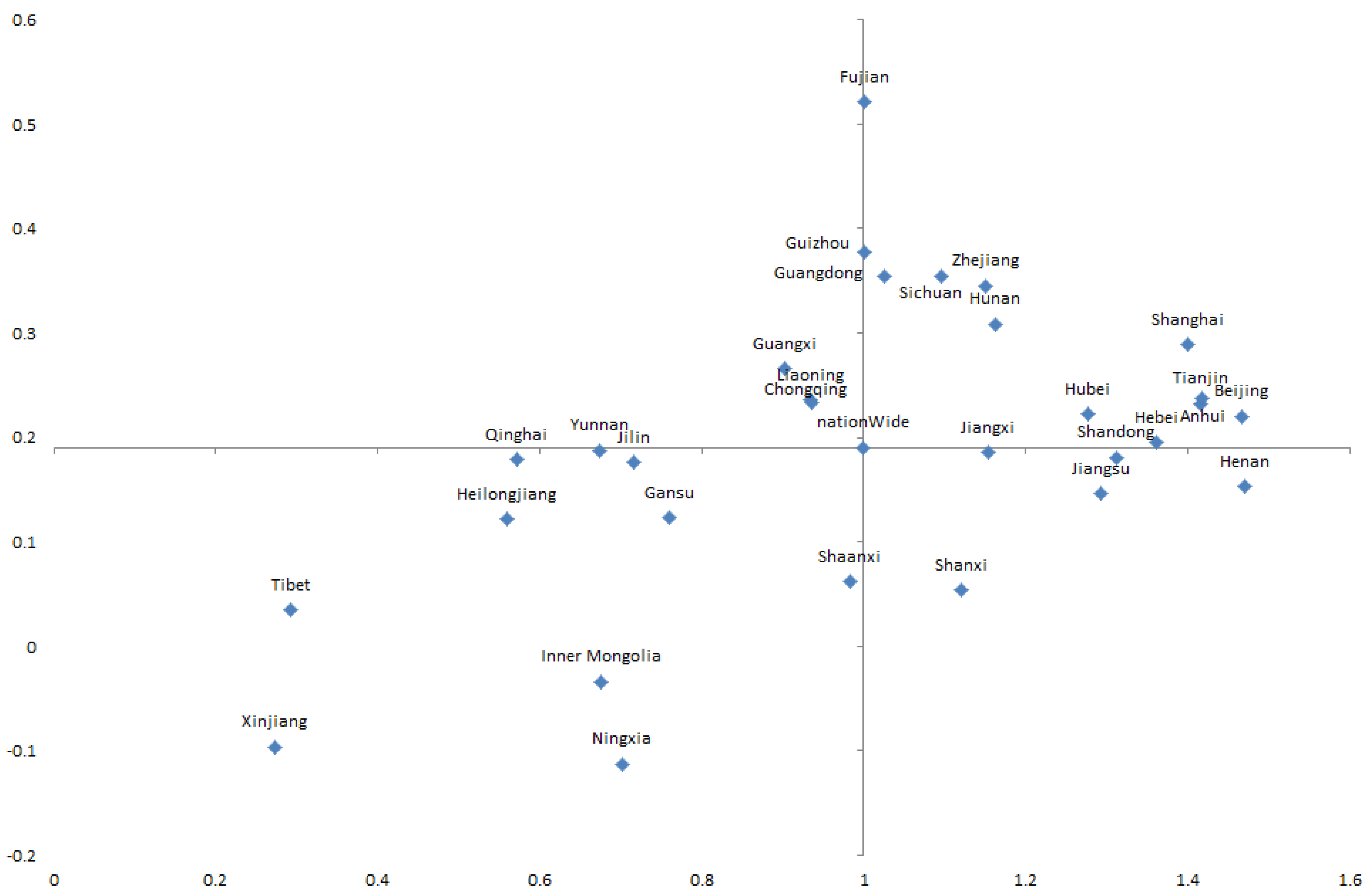 Three important patterns emerged. First, the average rail accessibility improvements experienced a rise of 19.29% at the national level (Table 1). This overall accessibility improvement indicates that the RTNC has become a more compact system over time. However, spatial variations of accessibility dynamics are obvious. Following the convention, we divided the whole sample into three regions: Eastern region, Central region, and Western region. The relative average accessibility ratio between the Eastern region and the nationwide level is 1.2, much higher than the Central region (1.16) and the Eastern region (0.75). In terms of accessibility change rates, we found substantial improvements in the Eastern region (a rise of 26.65%), as compared to other regions. Looking specifically at variations at the province level, provinces generally experienced accessibility improvements (Figure 1). The y-axis of Figure 1 plots the province-level accessibility growth rate between 2006 and 2014, whereas the x-axis of Figure 1 plots the relative ratio between mean accessibility levels by provinces and the national mean level. In terms of territorial polarizing effects, provinces from the Western region such as Xinjiang, Gansu experienced much lower accessibility growth rates than those from the Central and Eastern regions.