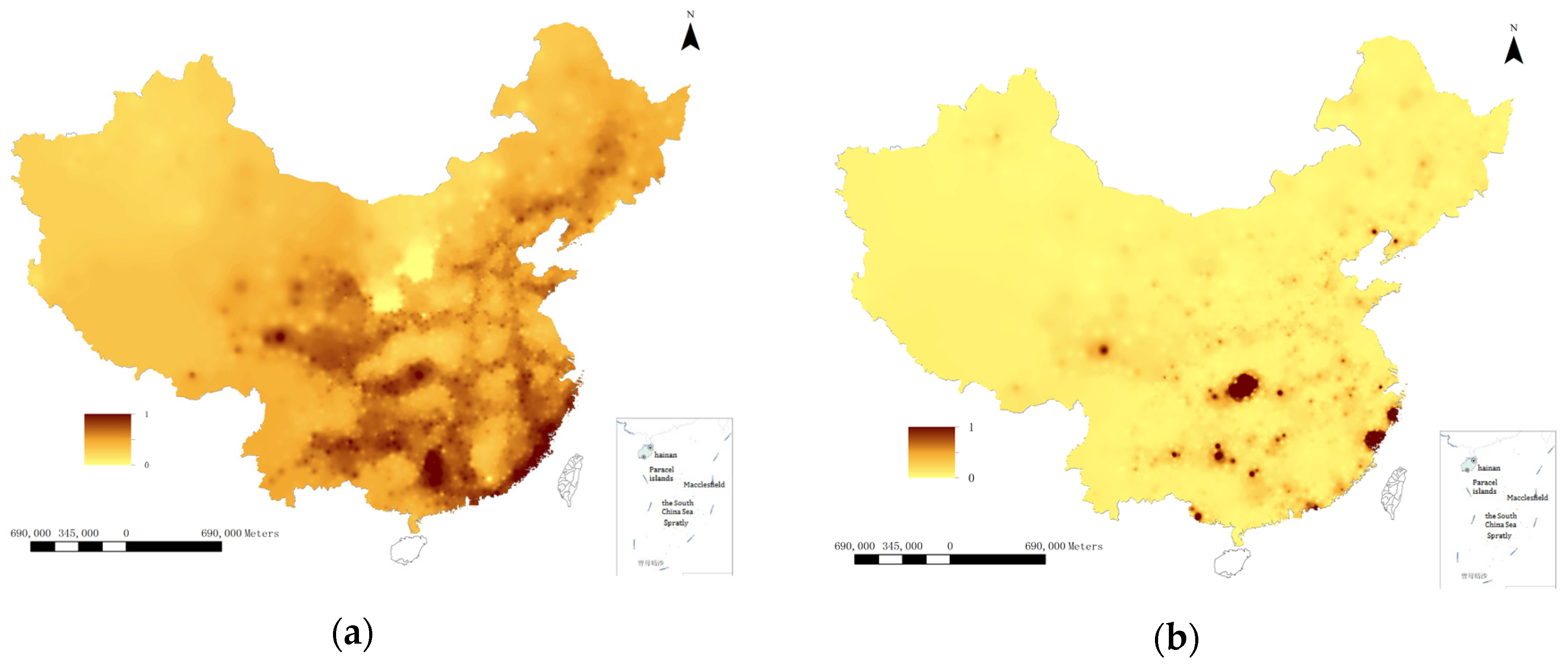 (a) Spatial distribution of county-level rail accessibility change rate (θ = 1); (b) Spatial distribution of county-level rail accessibility change rate (θ = 4).