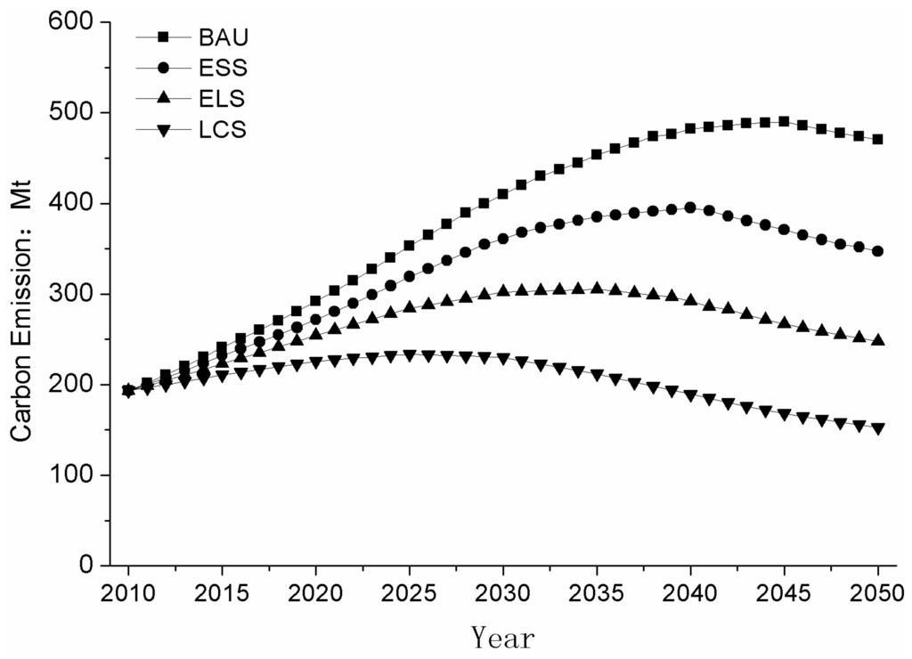 According to the modeling results, the tendencies of carbon emissions under the different scenarios showed the same status as Figure 3 and Table 3 showed. The peak volume all appeared during 2025 to 2045. According the tendency under the BAU, the peak volume would appear in 2045 and the value is 489.93 million tons. Meanwhile, there is the peak of curve at 2040 under the ESS and the value is 395.17 million tons. The same phenomenon appears at 2035 under the saving energy-LCS, the max value of carbon emissions is 305.25 million tons. Contrasting with the scenario above, the peak volume under the LCS would appear earlier and the value would be lower. The max value of carbon emission is 233.57 million tons by 2025. Based on the calculation results, we explored the accumulative value of the carbon emissions under different scenarios. Under the BAU, the value is 15.632 billion tons during the period from 2010 to 2050. The same value is 13.321 billion tons under the ESS. Meanwhile, the accumulation carbon emission from 2010 to 2050 is 10.971 billion tons under the saving energy-LCS. The lowest value among the scenarios is 8.379 billion tons under the LCS. By comparing the peak volume and the peak time under the different scenarios, the value of accumulative carbon emission during the period from 2010 to 2050 was lower in the case of the lower peak volume and earlier peak time.