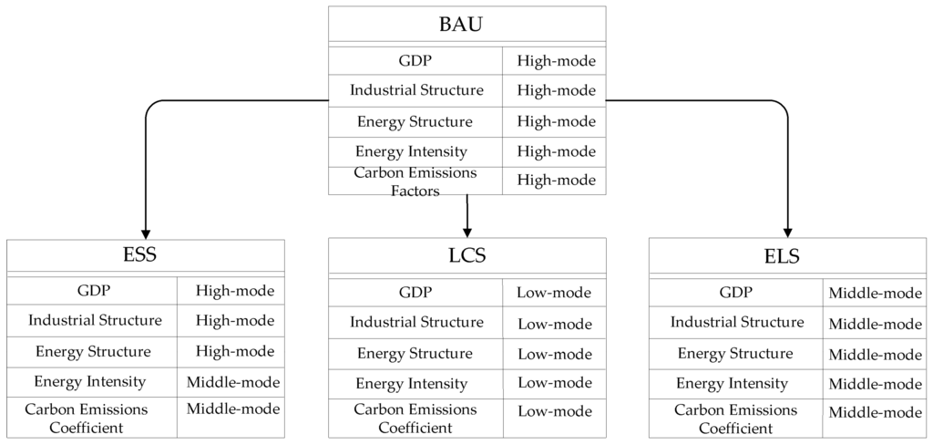 According to the analysis aforementioned, the main driving factors to control peak volume of carbon emissions were GDP, business structure, energy intensity and carbon emissions coefficient under every scenario (see Figure 4). GDP is the economic growth factor, business structure and energy structure are the structure factors, and the energy intensity and the carbon emission coefficient are the main technical factors. Comparing the values of the four driving factors under every scenario, the impact of GDP on carbon emission was most obvious among the factors. The energy intensity was the secondarily obvious factor as well as the business structure, and the energy structure was the third.