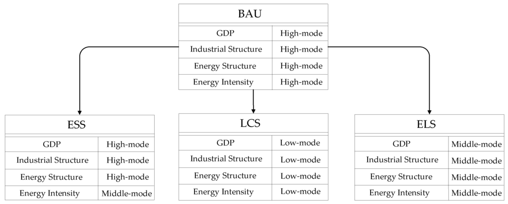 ESS was set based on the social development status of “the 11th Five-Year Plan”. In this scenario, energy saving scheme was taken into account, meanwhile the population and industrial structure kept the same developing level with that of BAU. The setting of future developing situation, such as, energy intensity, carbon emission coefficient and so on, is on the basis of the implementing level of the energy conservation and emission reduction policy to improve energy efficiency and the application of low-carbon technology. Based on the existing energy saving policy to promote the implement of carbon emission reduction, this scenario basically reflects the conditions of economic development and carbon emission status under the guidance of energy saving policy.