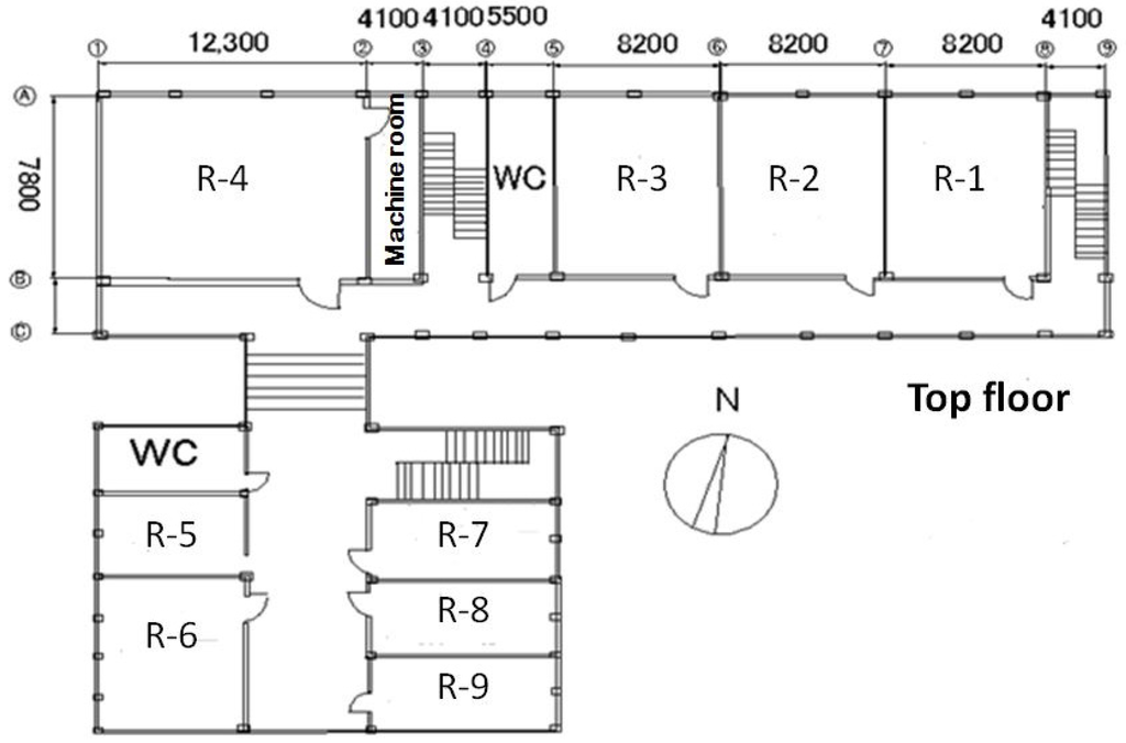 The subject school was chosen from 70 schools in Osaka. The roof appearance of the subject school covered with HR roofing sheets is shown in Figure 1. The ground plan of the top floor (the 4th floor) of the school building with a floor area of about 683 m2 is shown in Figure 2. Structures of the roof, floor, exterior wall, and interior wall are shown in Table 1.